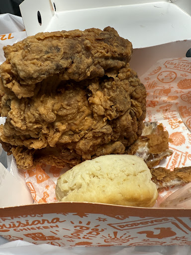 If I could rate this Popeyes location a -1 I would. I was in Douglasville visiting my son from Detroit and since the Popeyeâs locations at home are always so delicious I thought although this is a chain, but since itâs Down South surely it would be kicked up a notch. Was I ever so wrong! This had to be the absolute worst meal I have ever had. My sister started eating her food first and said it had no flavor. I ordered a two piece spicy all white with a sis of red beans and rice. I got a side of pasty red sauce with rice, no beans! I hadnât eaten since morning so I forced down the beans and the bland tasting wing. It tasted as if they mixed some type of no flavored hot spice in flour and coated the chicken. No salt no flavor no nothing! As you can see from the photo they had the nerve to put this blob of I donât know what in my bag and call It chicken. There was no way I was eating that as the wing was disgustingly. And this thing looked like it was bruised and probably had been sitting out and they dipped it in flour and cooked it again. You could see the layers of flour and nothing but grease! It looked like a meteorite that fell from Mars! If it hadnât been so late we would have definitely returned for a refund. You all should be ashamed of yourselves for serving such...