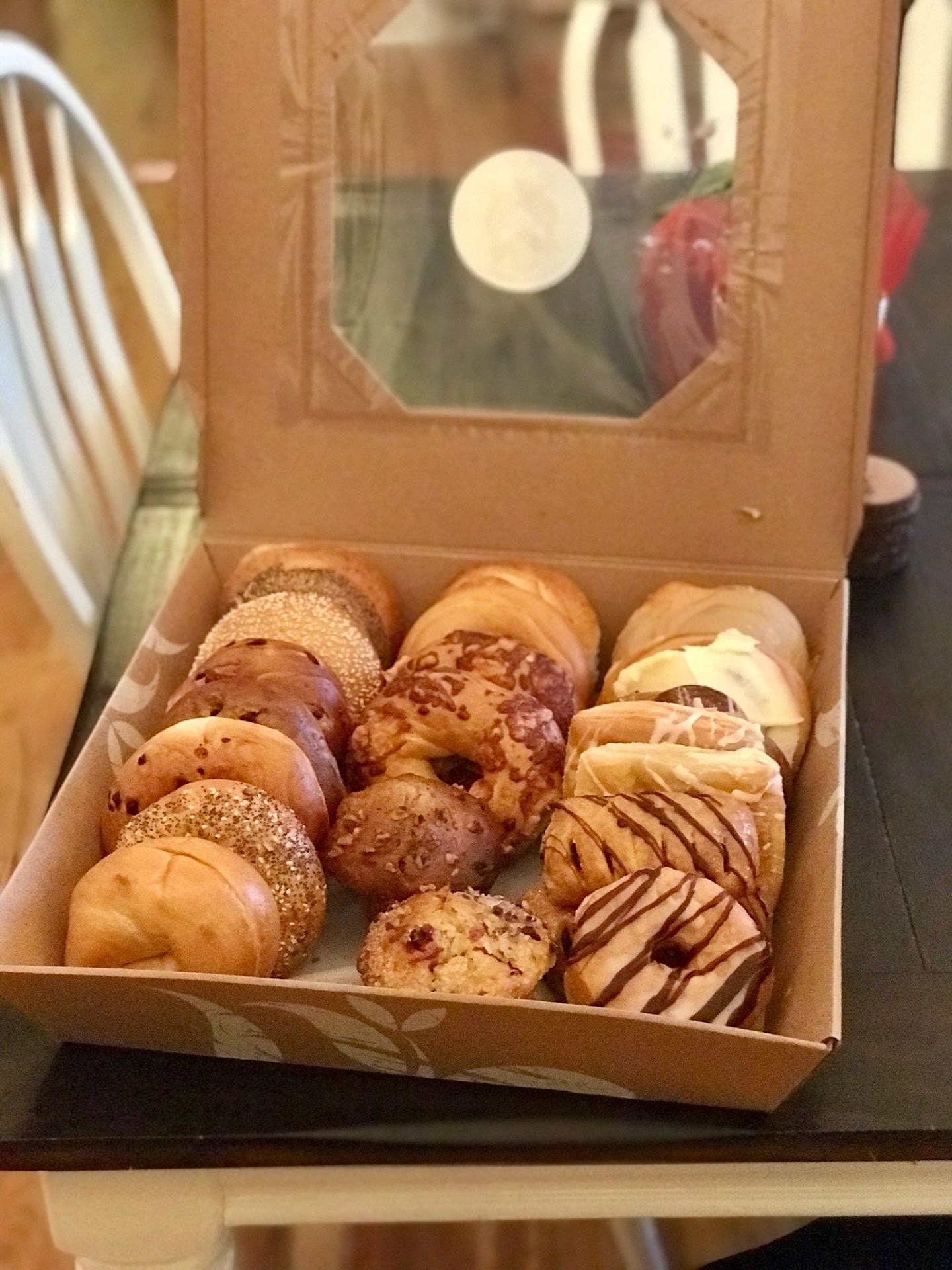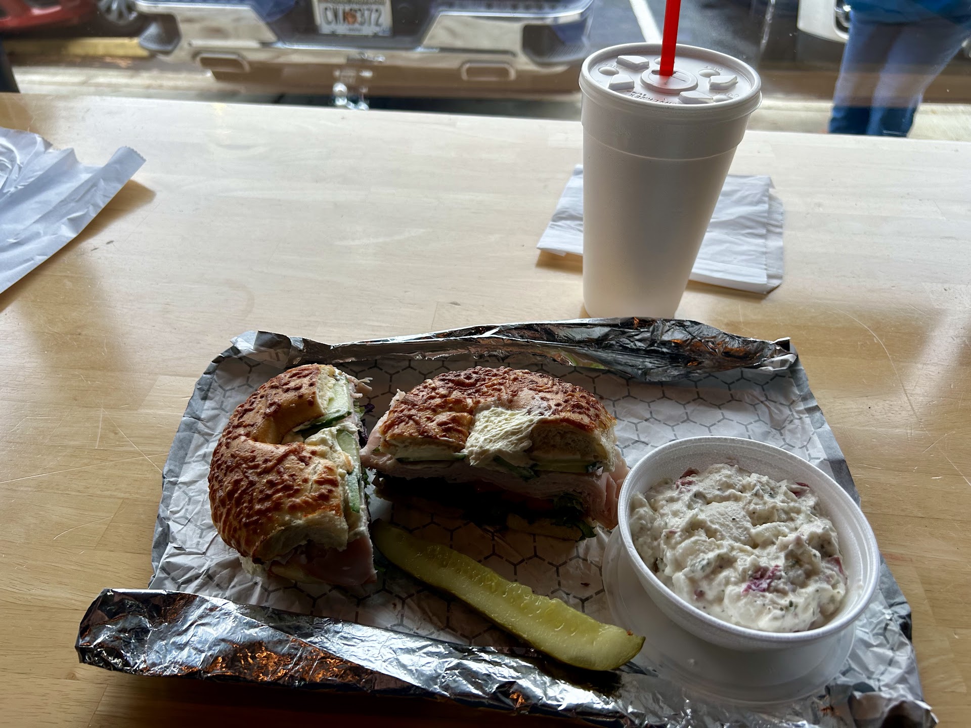 Read moreStopped in for the first time today. Place was clean, decent menu and prices, and the staff was friendly. Ordered a dozen and the two tub cream cheese deal. The bagels were fresh and care was used in making them. However, even with the two “tubs” of cream cheese is not enough to cover a dozen bagels. I toasted two bagels and just using merely adequate amount of cream cheese on both, the one tub is now less than half full. They whip their cream cheese, which makes it easier to spread, because it’s basically air whipped, making double the volume, but less actual cream cheese. If that’s your thing, you are set. I like my cream cheese heavy and thick, in it’s original form. You use less in it’s original form, even if you like it thick. Buy some Philly cream cheese from your grocery store if you prefer it to be original style and get more for your money. I also purchased veggie cream cheese, also whipped, and not impressed. Large slices of shredded carrots and very little anything else. The bagels themselves were that of an Einstein Bagel. They are soft and great for a sandwich. I’m a pinch, I would go again, and maybe buy a sandwich. I would go to Dunkin’ if I wanted to get another dozen. I personally think they are closer in texture, consistency, and flavor of original bagels. If you are looking for NY bagels, or anything close,...