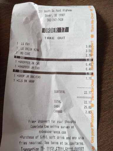 Read moreStopped while traveling through Dover. Arrived at 10:45pm and was asked if I had a mobile order. I said no, we are placing a regular order. The worker said, sorry ma’am we just took the last order. I asked when they closed, she said 11pm and that they stopped taking orders earlier than that so they could leave at 11. Mind you, Google says they are open until midnight on Fridays. We asked for the manager. She said she was the manager but laughed and refused to provide her name because “shes not required”, also stating she didn’t know who the owner was because “she just works there”. At that point there were 4 cars behind us and 2 in front and we were trapped in the drive thru. When we got up to the window, all of the workers disappeared from the kitchen…whoever owns this franchise location should know that their workers are rude and disrespectful, and not operating the establishment in a...