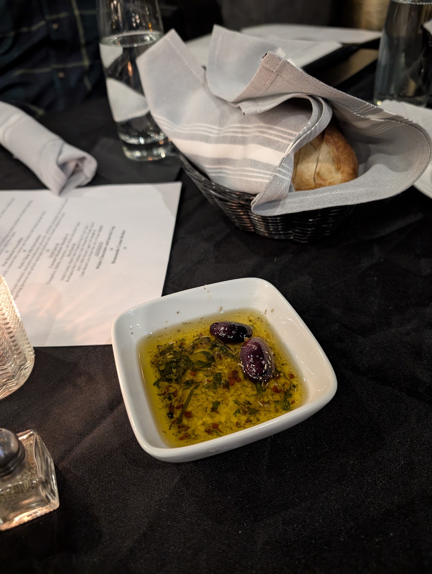 Everything on the menu sounded so good it was hard to decide on an entree. I usually get lobster ravioli but decided to go with the shrimp Florentine instead. It was deliciously tangy with lemon and artichoke. My husband was blown away by the enormous serving of short ribs, with a delicious potato au gratin and crisp green beans. Water, salt and pepper were on the table, and we were offered Parmesan and fresh ground pepper when served. Prices were completely reasonable for the the quality and size of the meals.