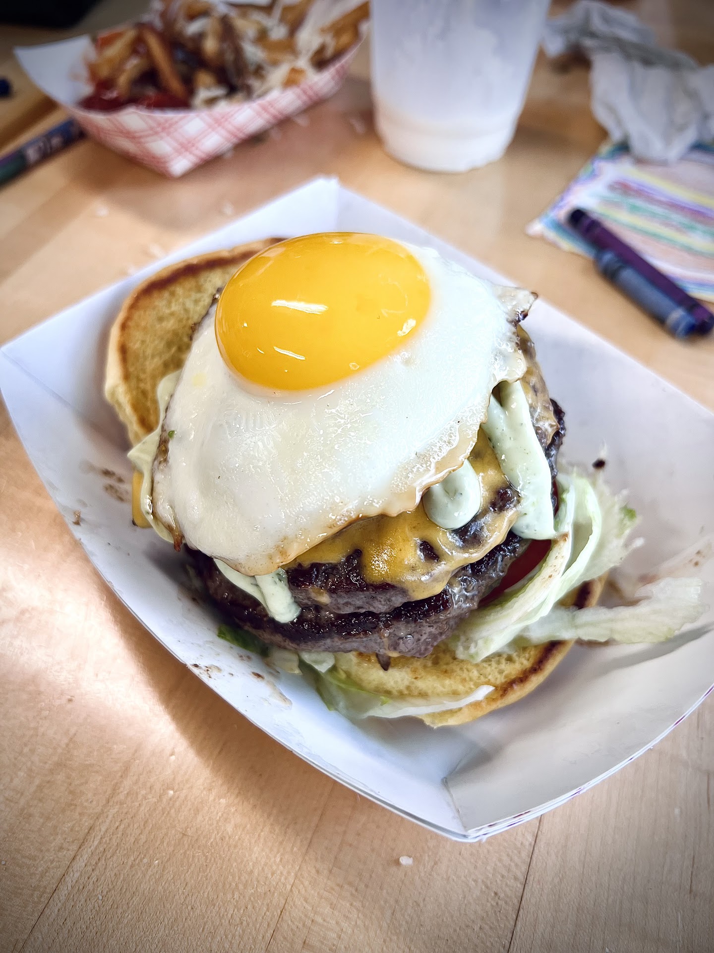 Read moreIt's a hamburger joint that should be in the fast food category, except getting your burger isn't fast. The basic unadorned burger is $7. Everything you add such as tomato, onion, cheese, etc., except lettuce, has a price tag on it. The burgers are good, but quite greasy. They're cooked medium and served on a nice roll. However, the place has zero atmosphere. It's neon bright, stark and noisy. For comparison, there's more atmosphere in a McDonald's or Burger King. Burgers and fries are served in a small paperboard tray much like you get when you order fries from a food truck. Fries are much thinner than the typical fast food fries and cooked to just short of burned. They too are greasy. Soft drinks come in a plastic bottle and will set you back about $3 each. Overall, a double burger at McDonalds or BK will serve you better and come at a much lower cost. Our tab for 2 cheeseburgers with tomatoes, onion & pickles, one small fries and two sodas was just short of $30. There are far better options available for...