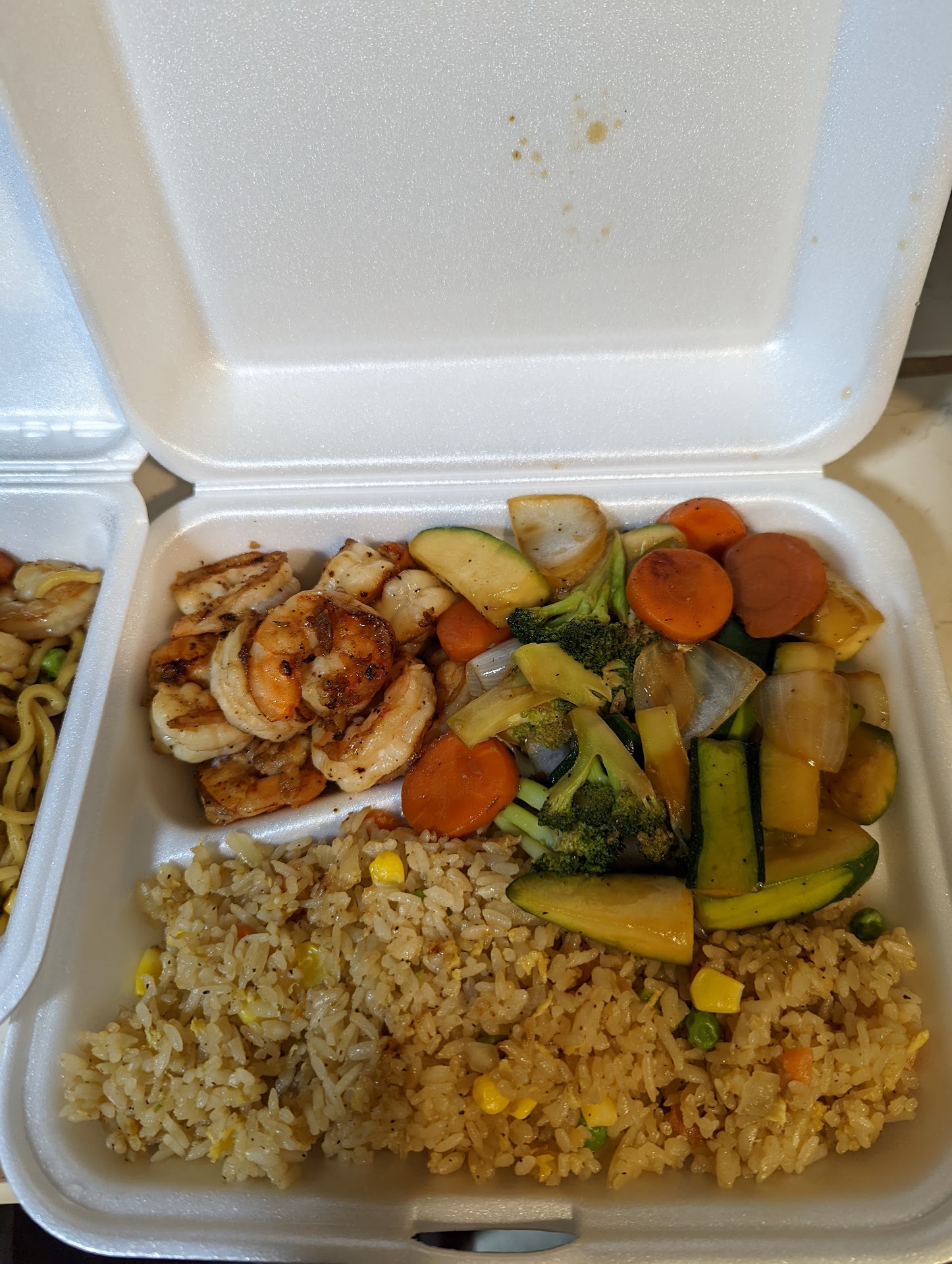 I ordered hibachi steak and shrimp with fried rice and vegetables with an order of crab rangoon, and the vegetables were the best part of the dish as they were the only thing that really had any flavor.
