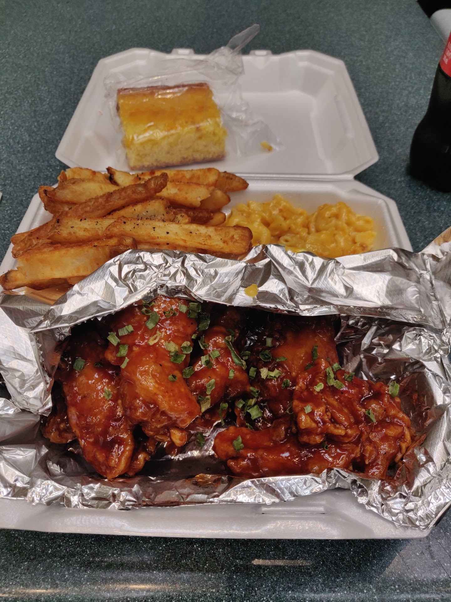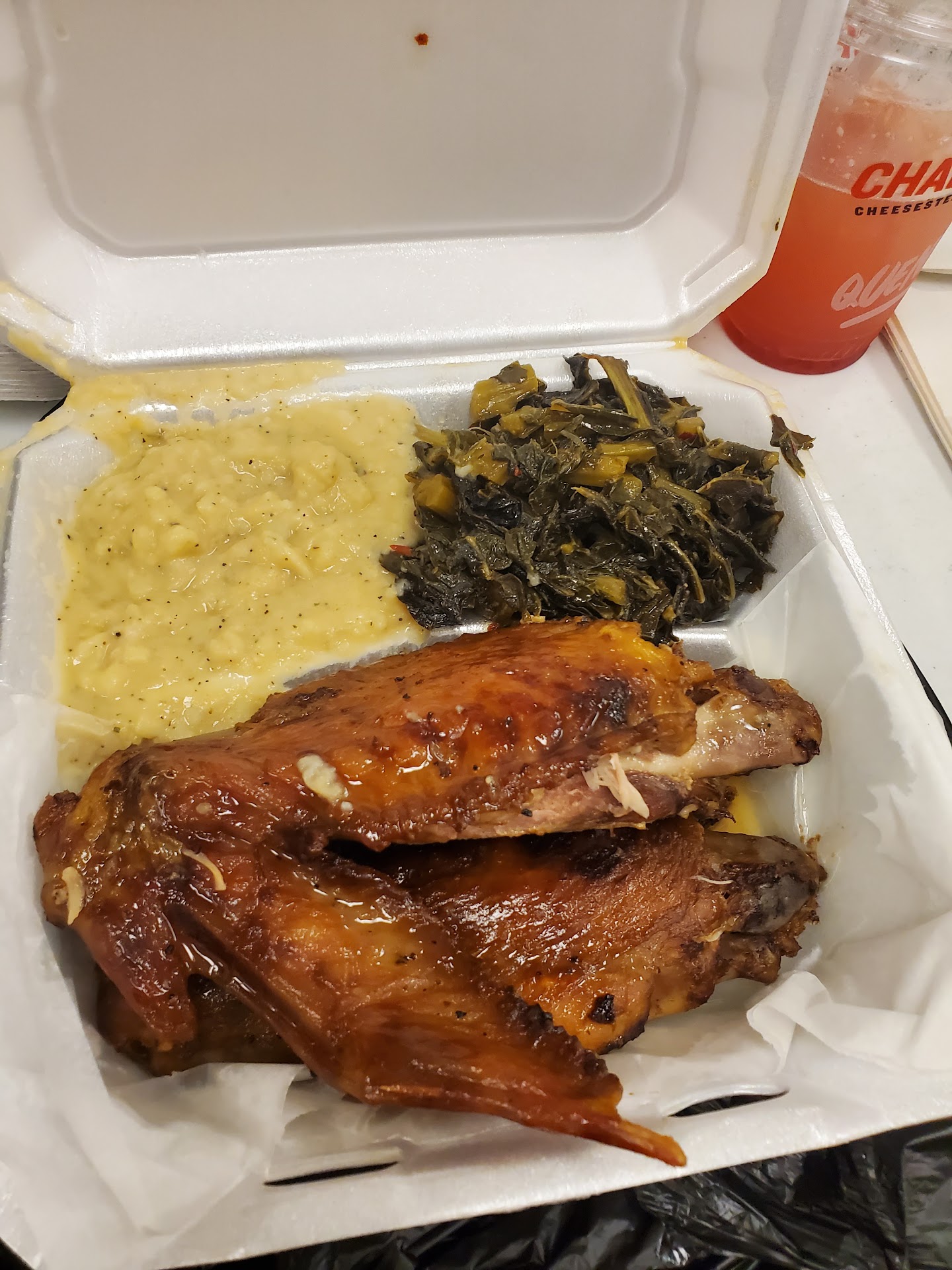 The server was very nice but the soul food is overpriced and not great. They don't print receipts so you have to give them your email or phone number to get one. The reason I mention this is because the meal I wanted that says "main course" was 10.99 and the person behind the counter said Teo sides come with it. The final price was more than I expected but they didn't want to give me a receipt without me giving personal information. Finally she pulled up the order and I could see that the "platter" (not shown on the menu) was 7.00 more than what I thought we were talking about. I got fried chicken (6 wing dings) with man n cheese, candied yams and an extra side of greens. I the Mac and cheese was not fantastic (not enough cheese). The candied yams were not done all the way through and had a strange after taste (almost sour taste) I couldn't recognize. The greens were sweet and there again was some seasoning I couldn't quite place. The chicken was not bad but had a burnt after taste (which may have been the grease). The cake tasted pretty good but the slice was not full. The narrow end was not on it! All in all I'm not sure I would try it again. Since they also have a Korean menu, you might have better...