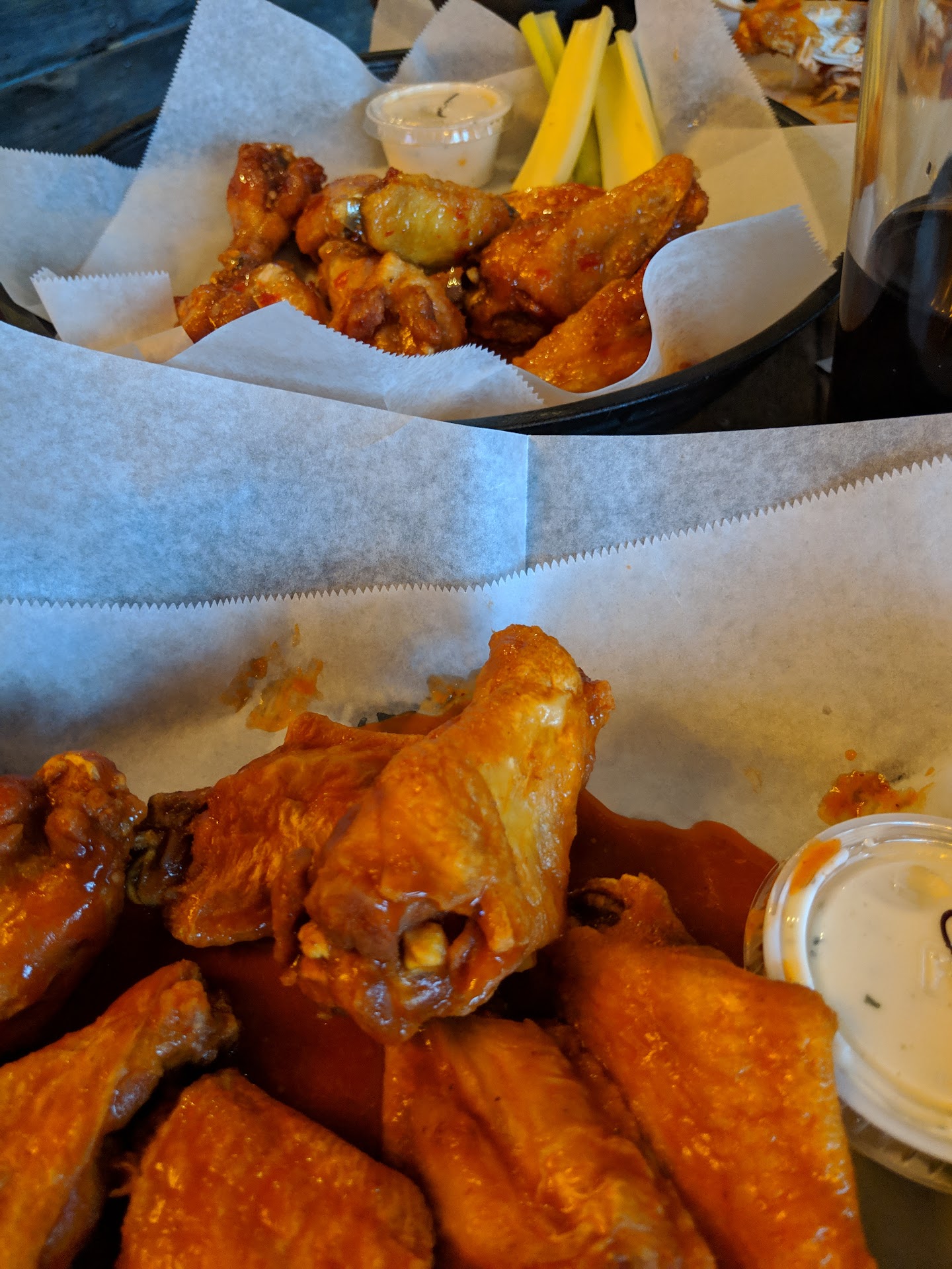 Also not impressed with the to-go packaging. We placed an order for 7+ people a week beforehand and when we got it home, the only thing marked to differentiate between items were the sides of ranch sauce (I assume to differentiate between that and blue cheese). None of the different chicken packages were marked and let me tell you ... it was difficult to tell a 5 piece regular/buffalo from a 5 piece "chili garlic". They looked identical and both had 2 limp, warm pieces of celery under the chicken...but I since they tasted almost identical - like chicken - guess it didn't matter much ...lol.