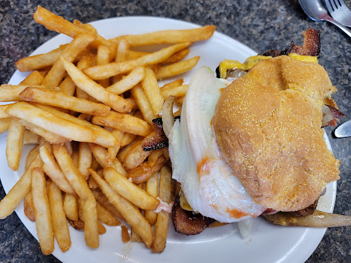 Read moreThe food is amazing! When they say they have the best bacon in town, they're not kidding. We recommend the bacon cheese burger, french toast, biscuits and gravy, eggs and pancakes. Yum! The restaurant wasn't the cleanest. Bathroom electrical was a little sketchy and no changing table. There was a large rack of plants littering dead leaves in the front of the restaurant. Soda products came in cans with a cup of ice. I can't imagine that's a cost saving measure, but it worked. It looked like many tables were evened up by old sugar packets and napkins. Many menu items were blacked out, but there were still plenty of items to choose from. There was only one server, but she was super friendly and seemed she knew a lot of the regulars. Food was a little slower, but they even have a phrase on the wall, "Fast food isn't good and good food isn't fast." Truer words have never been spoken in this establishment. When the dining area and bathrooms look neglected, I often wonder what the kitchen looks like, but honestly, the food was amazing, so I'd eat here again and we even recommended it to nearby family as we were in town for a funeral. The server mentioned to another table that they were waiting on the landlord to fix something. You've got some great food, you just need a building that reflects that - perhaps relocating to another building to get out from under the landlord who won't...