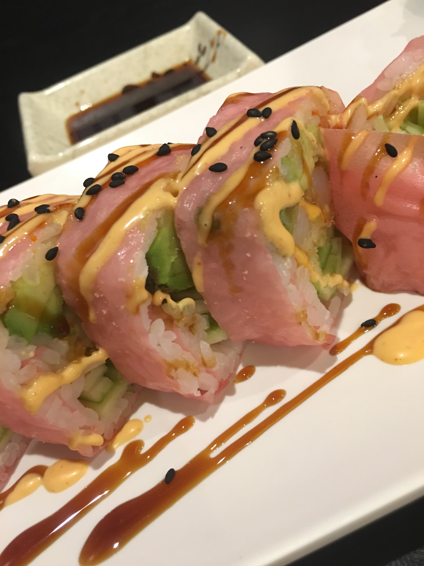 I went ahead and got the all you can eat special from their dinner menu, which is $22.99 opposed to the $17.99 lunch menu. I felt the price difference was worth it. I ordered one "Torched Dragon"(Cooked), one "Downers Grove"(Raw), one piece of super white tuna(Raw), one piece of the regular tuna(Raw), and one piece of Mackerel(Cooked).