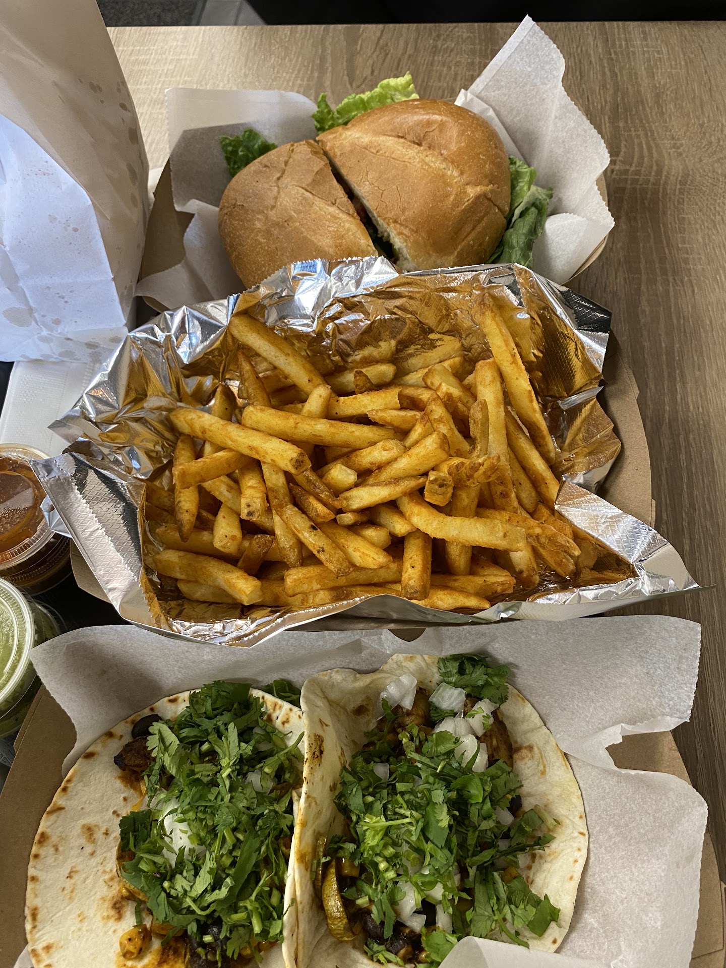 Read moreWe finally made it back to this place to try out their food. We had come on opening day but they ran out of food (around 6ish pm) and they weren’t taking any more orders. They asked us to come back in about 30 minutes but we didn’t want to wait so we went elsewhere. Today when he walked in, there was nobody inside when we walked in however the lady at the cashier was taking a phone order. There were people behind her prepping the food. Nobody acknowledged us or even said hi. A guy came up, he was very nice and he tried to ring us out but the lady on the phone had to assist him. The one thing that really bugged me was that the lady’s mask was not on properly, her nose was completely out. I ordered the veggie tacos and I confirmed the ingredients I had read on the menu: black beans, zucchini, corn, tomato-I then picked the onion and cilantro option for the tacos. My tacos did not have any tomatoes on them. The food was good. I was not a fan of the fries. The guacamole was good, just a smaller portion than I expected. Maybe I’ll give them another shot,...
