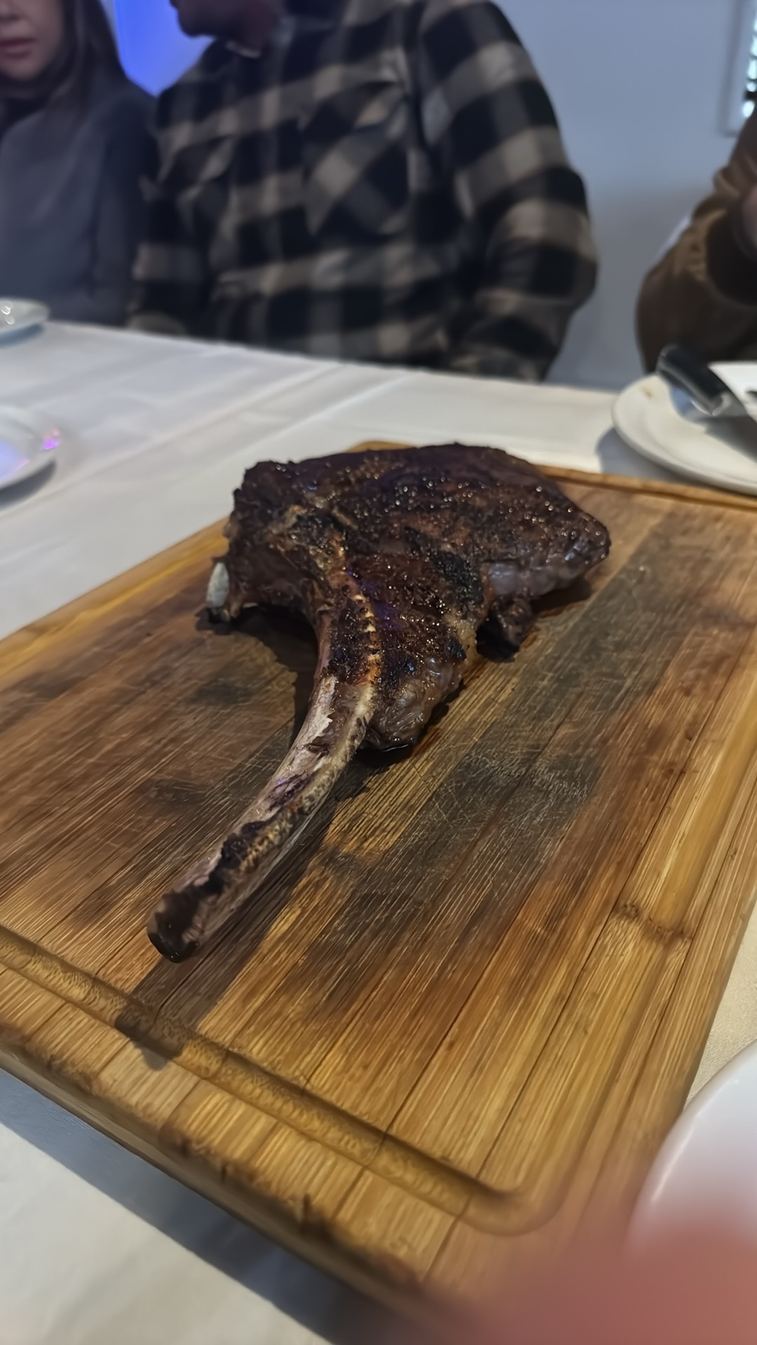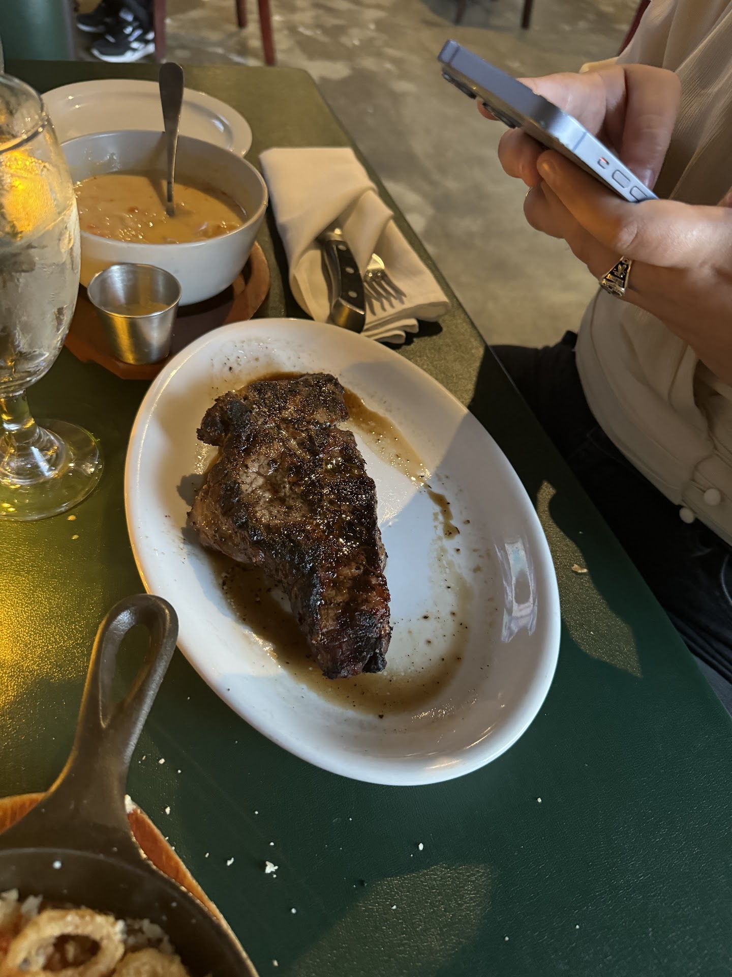 I ordered a Bone In Ribeye Med Rare that arrived to the table with no bone and not evenly cooked. My wife ordered a Filet, Medium that was parts rare, black and blue and Med Well. I had a side of garlic mashed potatoes that weren’t terrible but not great for a “fancy steakhouse”. My wife ordered the mushroom ragu that was supposed to come with a tomato sauce but it arrived with wild mushrooms and a ton of bell peppers… no sauce.