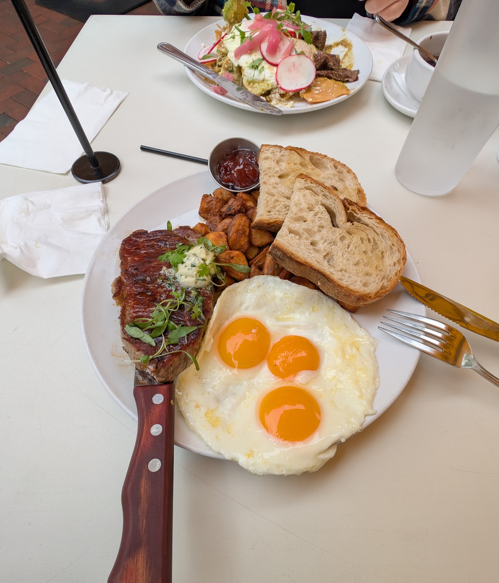 Read moreLooking for a good breakfast place while visiting Downey Ca, I may have found one. This popular local spot uses fresh ingredients to create their dishes. The food is good, portions are generous and all are priced accordingly. The French Toast was very flavorful and the bread was cooked perfectly, unlike other establishments where the bread tends to be a bit firmer (hard) which, negatively impacts the overall taste of the dish. The Steak and Eggs were good but the steak did lack seasoning and flavor and tasted a bit bland. The inside dining area is spacious, clean and can accommodate large groups. Outdoor seating is available should you desire. The painted wall decor is colorful creating a soothing relaxed atmosphere. The operational efficiency on how customers are greeted, seated and served is very much customer service friendly. You’re initially met by a greeter who directs you to a QR code where you’re able to view the menu and order. You’re then directed to a cashier where you pay for the meal (In advance, tip optional) and are then seated. Within 8 short minutes your food arrives table side. This process does have one distinct advantage, which, is your food arrives much quicker than most. The draw back, it’s already paid for if you’re dissatisfied. The servers were friendly and very attentive. I would suggest you arrive early since, it can get very busy. With that, other than the steak missing the mark, overall, I believe you’ll enjoy your dining experience here and would recommend this...