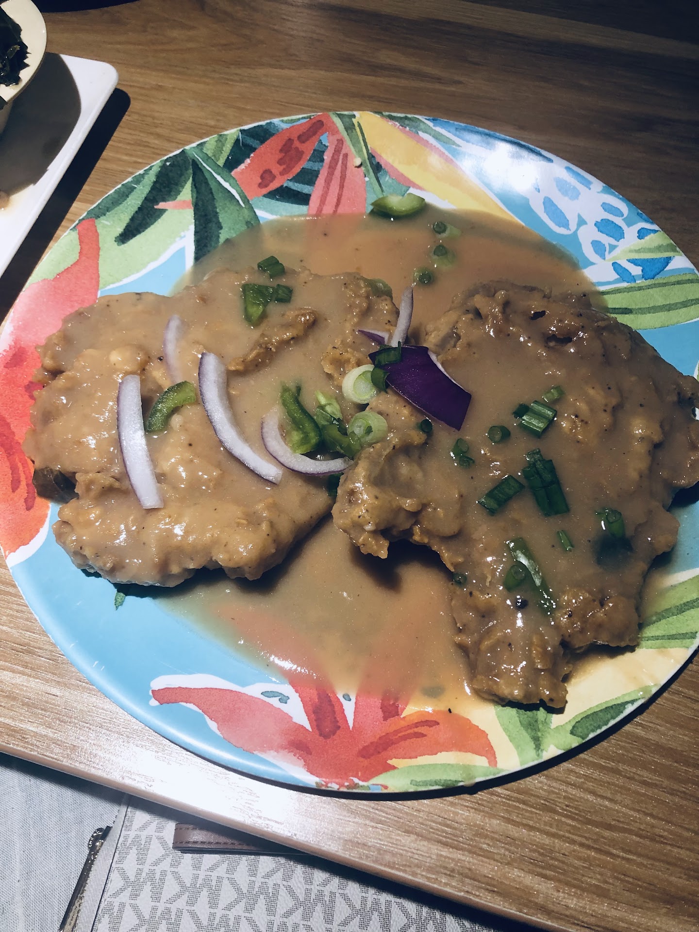 Now, regarding the food, my opinions are quite mixed. Most dishes were well-seasoned, but I found the smothered pork chops disappointing. Although they had a crispy exterior, they were topped with gravy rather than being smothered and baked, which did not meet my expectations. Instead, they resembled fried pork chops with turkey gravy and fresh diced onions. Not traditional at all. Additionally, the pork chops were quite fatty, and a true smothered pork chop should melt in your mouth.