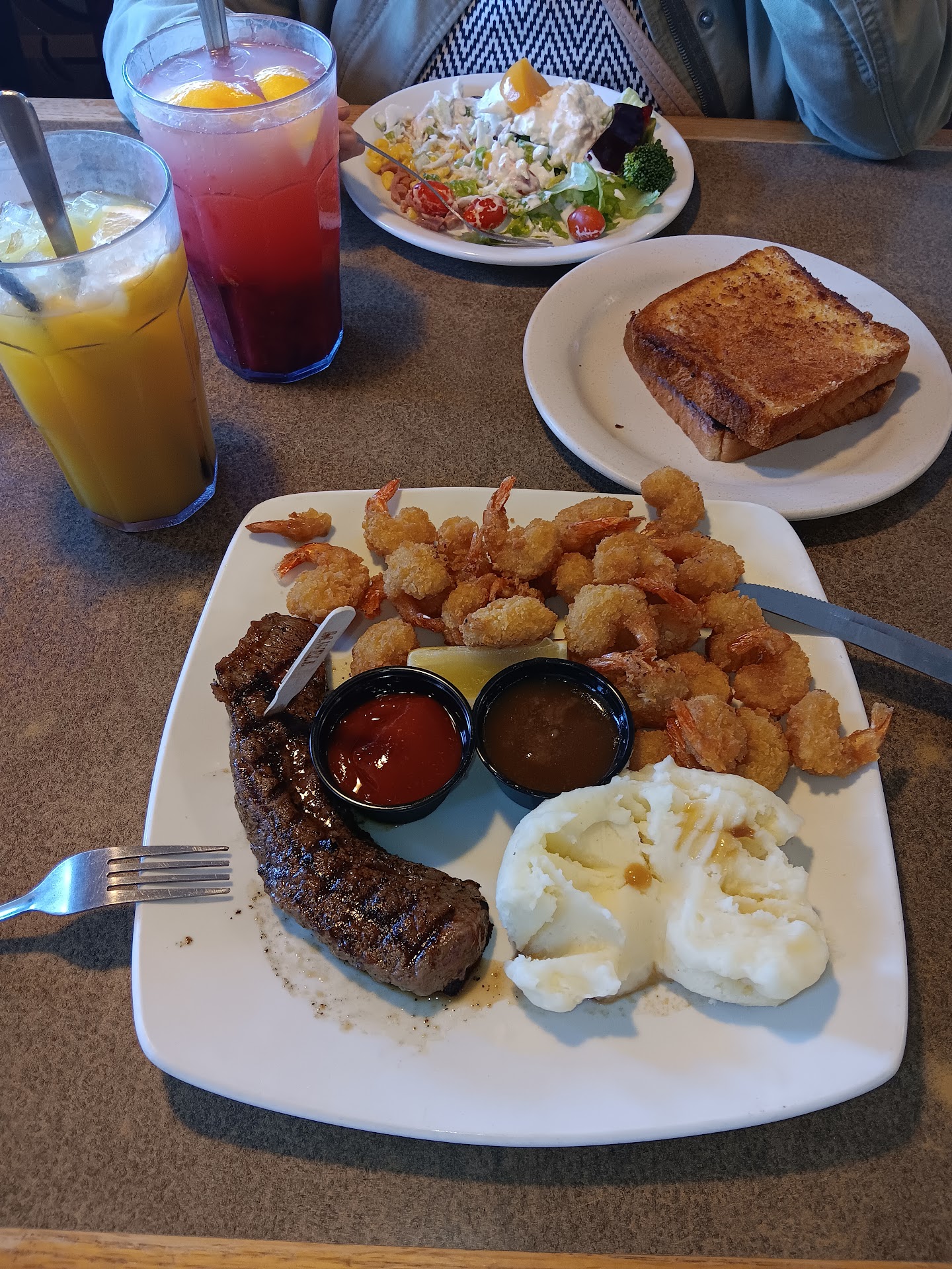 Consistency Matters: I ordered the steak & shrimp with salad bar. The first disappointment was that they didnât carry the classic French dressing Iâve always lovedâa small detail, but a big deal to a long-time customer. (The other location still has it.) Then, I sat down and waited for a server to bring the salad bar plate and bowlâsomething every other Sizzler has always done. No one came. When I finally asked, I was told it's "serve yourself" hereâagain, inconsistent with other locations.