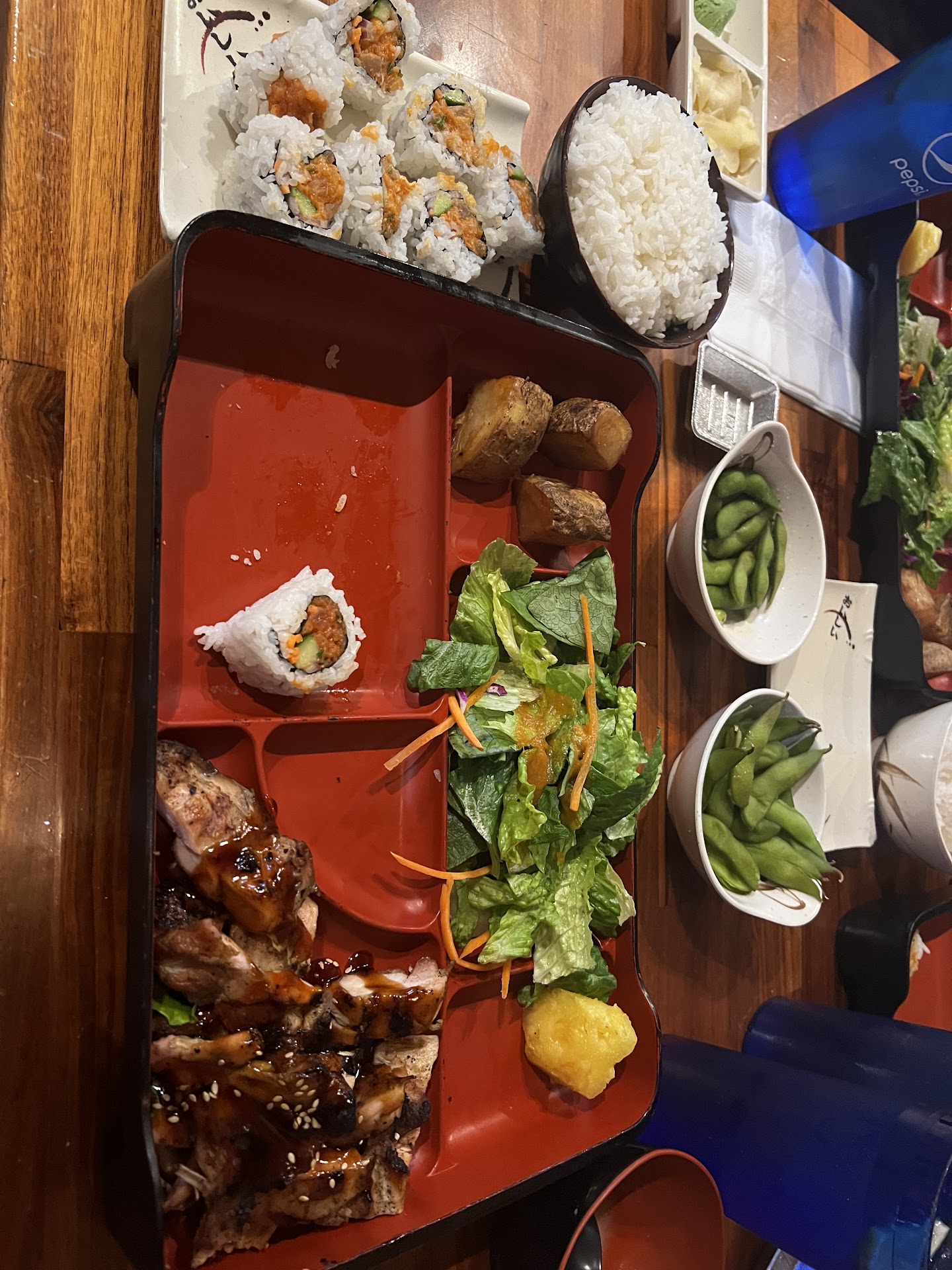 We visited over the weekend and had the lunch bento box. Not only was the server unhappy to work there, they got our order wrong. It took a while to get our food so we didnât bother asking the server but the server also didnât offer to make things right despite hearing us say that we got our food wrong. We got the 2 entree bento. We got the salmon teriyaki, chicken teriyaki, beef teriyaki. All meat were over cooked and dry. Little teriyaki sauce that wasnât brushed but dripped. The sushi roles were average. Miso soup, edamame, side salad also average. The most random side dish were potato wedges that were cold and tasteless that felt like space fillers.