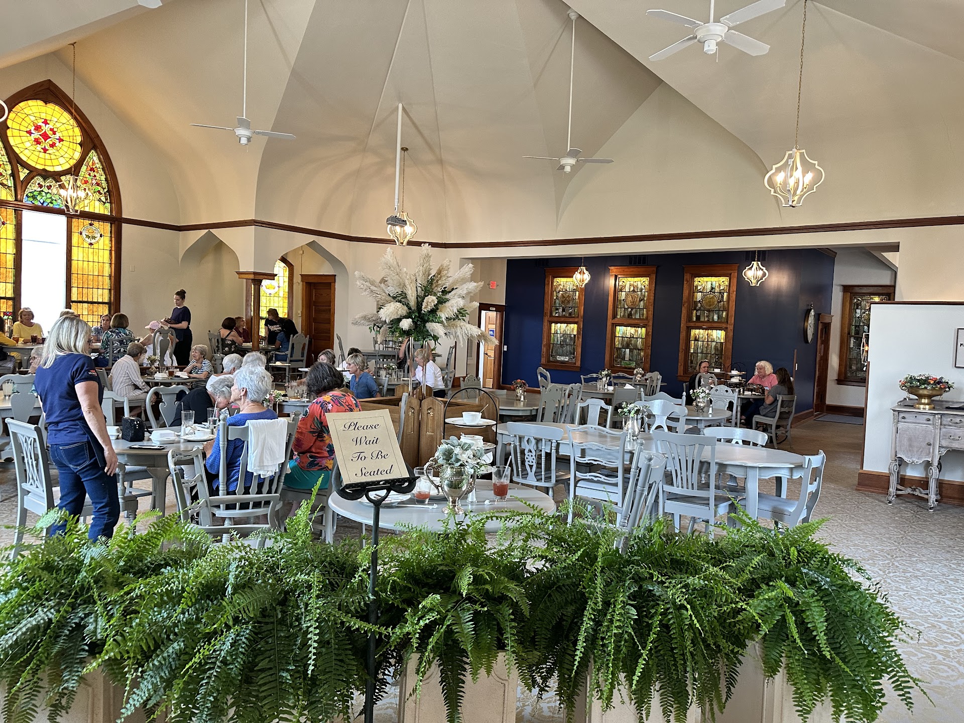 This is a beautiful tea room in a restored church. The stenciled floor and stained glass windows are gorgeous.I was not overly impressed with the food. I’ve been to many tea rooms before and the food presentation was just ok. The sandwich that I chose was good but nothing outstanding . The second layer was two little potato teuf-teuf and the third layer a pot de crème. $22.50 before tax and tip for basically a sandwich, a small potato muffin and little dessert. I’m not sure if the desserts were homemade but they did not seem to be anything remarkable. I am only writing this review in hopes that they might be more generous in the amount of food served and have a more impressive presentation of the food. I want them to have a successful business. I suggest visiting the Mackinaw tea room and learn what they do to make them so successful. The staff were very welcoming...