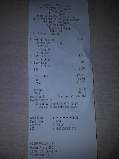 Read moreI ordered a breakfast burrito around 9am. I couldn't pick it up right away. Because I work next door and I waited to kill the rush. One hour and half or so later. I walk to the establishment Chick-fil-A on Sand Lake Road and my order was nowhere to be found. I ask an employee for my order. She goes to the manager or supervisor Brandy Blubbly (name given by employee), employee comes back tells me there is no order. I look for my receipt and I show her. She goes back to Brandy (whom at this point has no interest in paying any attention, since she has her back to me the entire time). Comes back and tells me they threw it out. That's the only moment Brandy turns around and tells me, they threw it out. "Because it was sitting there for an hour an a half and wasn't fresh".