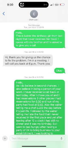 Read moreIf I could give zero reviews I would ! I had a TERRIBLE experience on my bday. I set reservations a week in advance. Arrived the tables were just getting set. Reservation at 6:30 at 9:15 I asked the waiter to atleast bring the salad. They did at 9:45 no one in my party had food. At 10 I got fed up and asked for checks and food started coming and they wouldnât even give us a to go by x without paying. Then the waiter told me they lost a chef the night before so itâs just life . Then my food never came mind you itâs my 27th birthday. The chef finally came out and ask to make it but I refused do to feeling sick for not eating and I arrived at 6:30 itâs 10:00. The chef then reached out to make it right . I agreed to let him but he doesnât even text back or stick to his word and he is the owner. SADDDD . I am going to contact the sentinel and news. This place needs to be shut down. Iâm over it I donât even want nothing from here. I had a party of 26 and they made well over $800 off my party and I never got my food I went to bed on my 27th birthday hungry . My worst birthday ever shouldâve went with my first restaurant choice. Ppl were walking out...