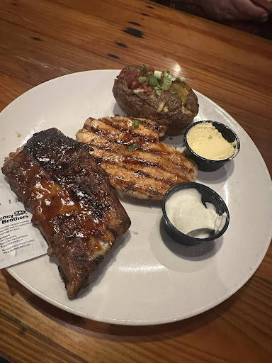 A manager was seen walking past us and smiled, prior to our food arriving. Our food came and we had no utensils. The food runner graciously went and got them for us. My friends had no complaints about their meals. I found mine to be undesirable. The baked potato was far from fresh. I attempted two bites. The peach bbq chicken and ribs lacked sauce. It was barely present. When the server came back, he asked how everything was and my friends said fine and I said mine was extremely dry. He asked if I wanted him to get a manager and I said, āNo, how about some bbq sauce?ā He brought back some bbq after checking on his other tables. By this time, I became completely dissatisfied with my meal.