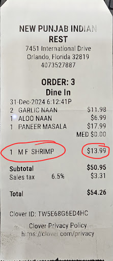 Read moreSCAM ALERT! CHECK YOUR RECEIPT CAREFULLY BEFORE PAYING!! Had been to this restaurant last month. There were hardly anyone in the restaurant (just 1 other family seated in the corner and rest of the tables empty) which gave me early indications about the quality of this restaurant. However wanted to give the benefit of doubt and still try here. Checked the buffet items and it was not worth $20 so ordered some naan and paneer masala. Naan was good however paneer masala was like raw panner submerged in yellow colored hot water.. tasteless. It was pathetic! After having a bad tasteless food time to pay for the unworthy food. Asked for the receipt and found that an extra item (shrimp) was added which I hadn't ordered. It couldn't have been a mistake since the old lady (about 55 - 65 years aged) who took the order was the one who printed the receipt at cash register. There were no orders after me and it wasn't crowded to get confused or make any mistakes with the order. It seemed more like a deliberate attempt to scam me. Guess they dont do to regular customers. So please check your receipt since this restaurant seems to get away by scamming tourists.
