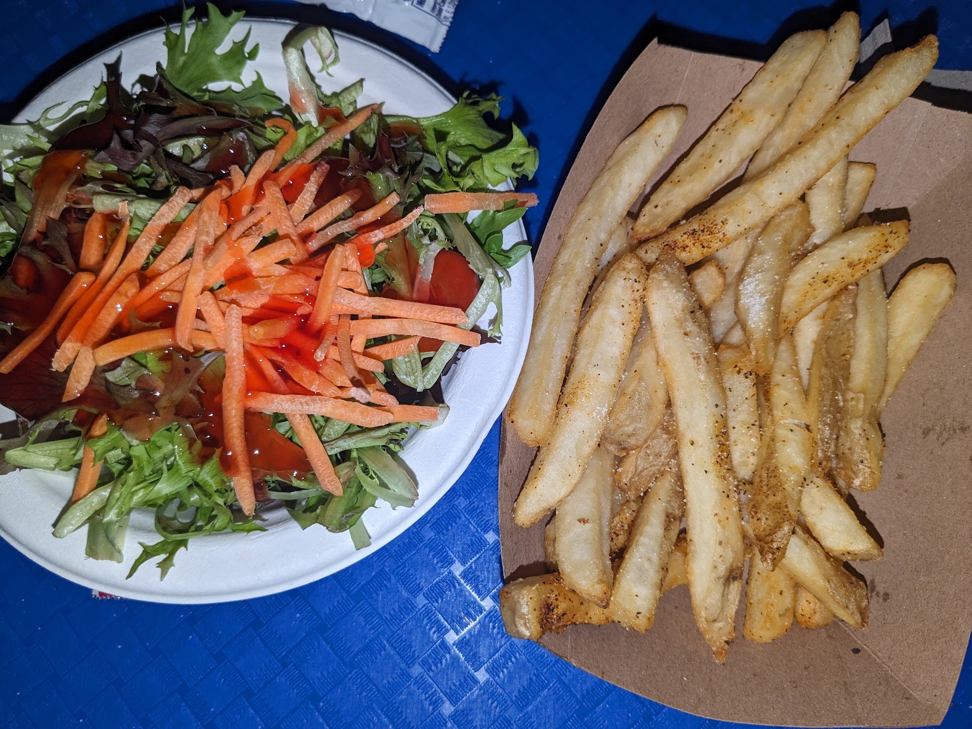PROS: The fries are good and they have chicken tenders, mac and cheese, and uncrustables with oranges. So, for bringing kids along to this place, that can come in handy. They do offer healthy options like grilled chicken over some fresh greens with matchstick carrots and cherry tomatoes, “fresh fruit,” which in this day was some tangerines, and a grilled chicken wrap (mostly wrap breading).