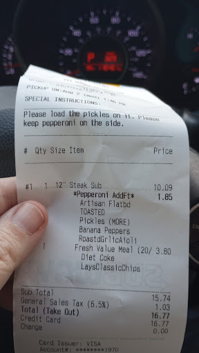 Anyway - a sour attitude sucks, but the meal wasn't any better. All there was in the veggie trays were frozen tomatoes, wilted lettuce and some cucumbers. Everything else was gone. I choose Subway because I love the fresh vegetables - there were literally none to have that day. No pickles, no banana peppers, no onions, etc. She ran out of mayo making the sandwich, huffed to the back and then put so much on that I had to spoon it off once I got home (1/2 cup?). Crazy.
