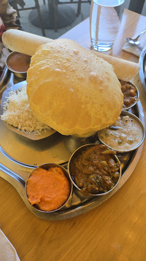 The thalis were a generous portion and a good representation of various dishes, but I was surprised to find the South Indian items less flavorful than the North Indian ones. The North Indian offerings, such as paneer and dal, were well-seasoned and satisfying. The halwa served as part of the thali was a highlight, with its rich and sweet taste.