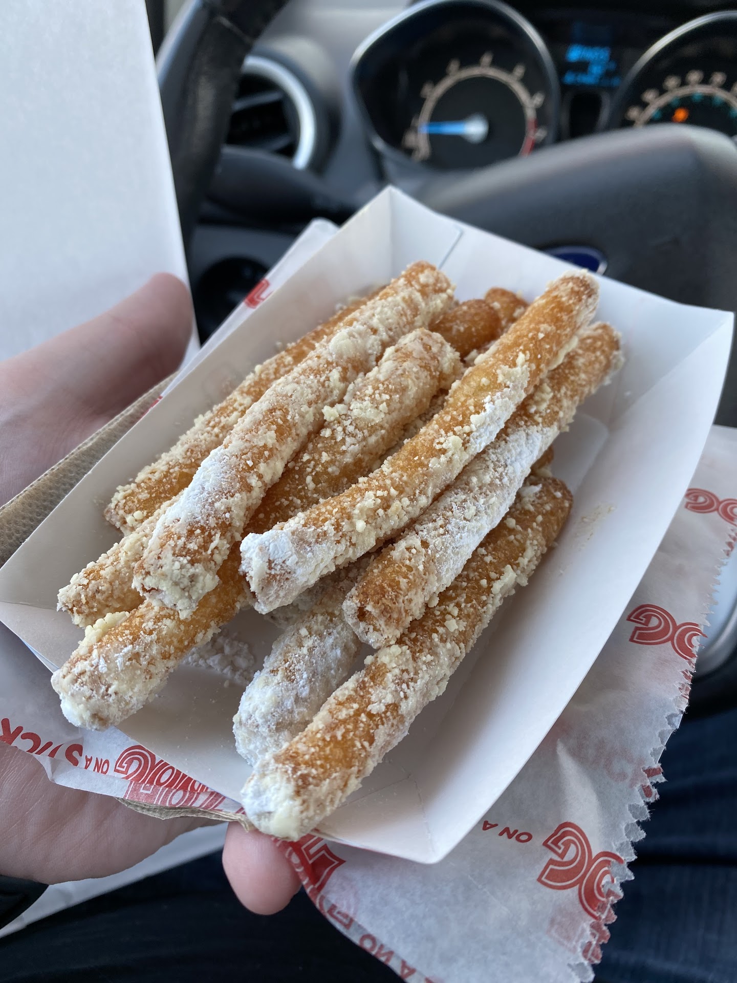 Went through the drive-through this afternoon. I don't think I've been to a Hot Dog on a Stick in ten years or more. I was really pleasantly surprised! They offer a veggie dog, which I got along with a cheese dog. They cooked it to-order so it took a couple of minutes, but I didn't mind because it at least meant the food was freshly cooked and not under heat lamps. The corn dogs were basically amazing, I actually loved them! The french fries are your garden-variety prepared/frozen and I won't get them again. However, the service was wonderful, she was super professional, clear, and kind. Absolutely not what'd I'd expect from fast food like that. All-around it's great and I recommend a visit for some quick, cheap,...