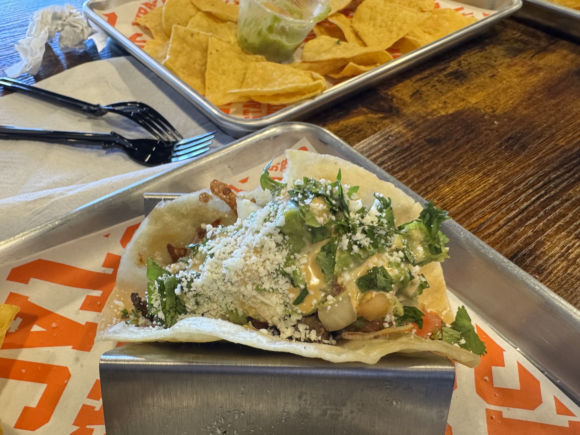 Read moreDisappointed. There was quite a line when we got there but it was noon. We waited 35 minutes for 2 Taco's and nachos. I ordered a premium steak taco which comes with chipotle sauce. I received some kind of chicken taco with a sweet green sauce. My husband ordered a carne asada taco. This also had a sweet sauce on it but, it was red. The cheese for the nachos was very soupy and just not very good. 7-11 has better nacho cheese. The hot sauce was hot, but bland and had no flavor. Not sure how that is possible. The customer service was decent but it looked like they were all overwhelmed. While we sat there for 30 minutes we saw several other orders were prepared wrong. Kinda of pricey for what you get. Not sure I'll go back. Tacos just are supposed to...
