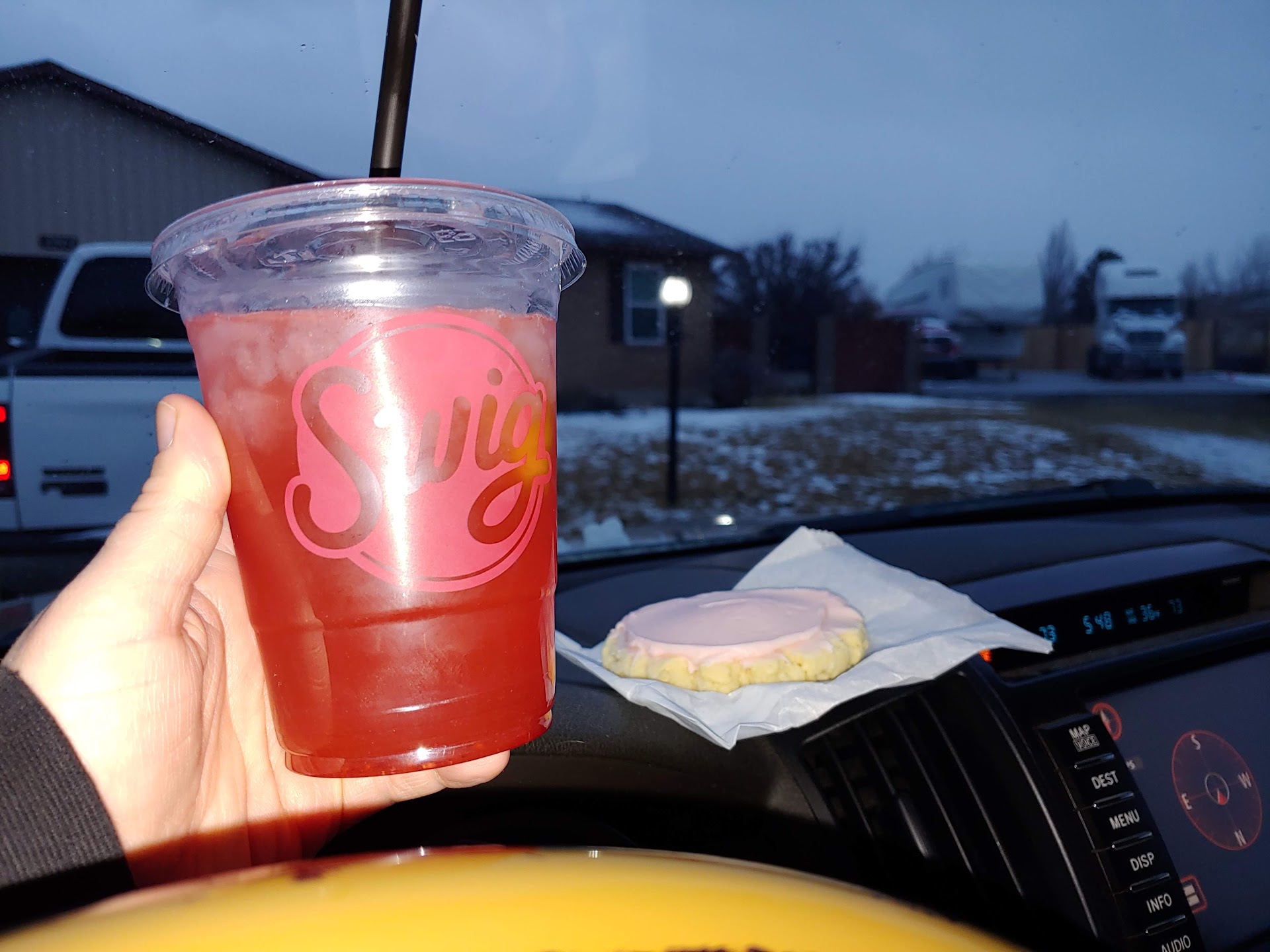 Read moreThis past year I have discovered Swig drinks. Each one I have tried has been so good. This last time I tried "The Fighter" which is one of their refreshers. It was so good. The kids kept trying to snag a sip. It was a great alternative to wanting something a bit more than water but not as sugar filled as a soda. However the kids always beg for a cookie no matter what. Their sugar cookies are the bomb...... This was the first time I had been to the draper location. The drive through is a bit awkward to get to as the normal parking lot doesn't have open access to it. You have to drive all the way around another building access it. When I first started in the drive through line it was super long and I almost left. However I noticed how quick moving it was. They had a very fast an efficient process to get...