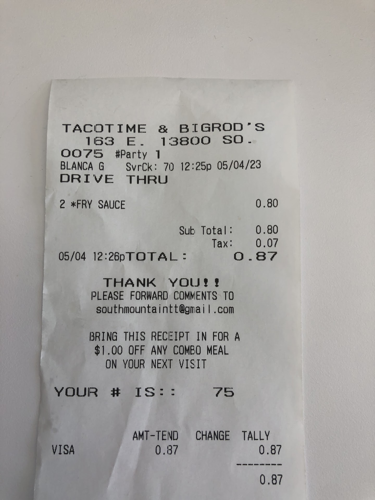 Decided to use the old drive thru... Now, I am disabled mind you and have an issue walking. So, I order my usual 6 tacos special with 6 ranch cups as oddly enough their tacos taste GREAT with ranch!!! And their ranch is terrific!!! The reason they don't get 5 stars EVEN THOUGH... Dave was an awesome, Christ-like gentleman was due to the rude treatment from the kid in the drive thru. So, at this Tacotime if you use the drive thru apparently they charge you for ranch where as if you go in, theyre free! Being disabled I used the drive thru due to my pain level today. After was and waiting... i still had to go in because the little brat wanted to charge me almost a buck a piece for the ranch. I go in and speak to Dave, the manager... What a kind, wonderful guy! He offered to give me my food... I wasn't their for free food and insisted on paying... but instead of being charged $11.35 like the kid wanted to charge me, i paid the normal $9.70(after tax). I was happy. But a word of advice to Tacotime... dont charge for what can be had for free in the dining room! Especially since I am disabled. That is, or rather could be considered discriminatory... seriously... i can't walk well and its easy for me to drive thru. But if I am normal, I can come in and get ranch for free? ...at my expense, adding to my pain and discomfort. I want to personally thank Dave for being so kind to me! I highly recommend this Tacotime based on my exp with Dave. Great guy, and thank you my friend for your gracious...
