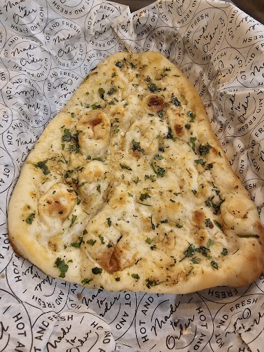 Naan - the shape, taste, texture is identical to Trader Joe’s frozen packaged naan - not saying that’s what they serve but I love TJ’s naan and eat it all the time - I’d swear it’s the same.