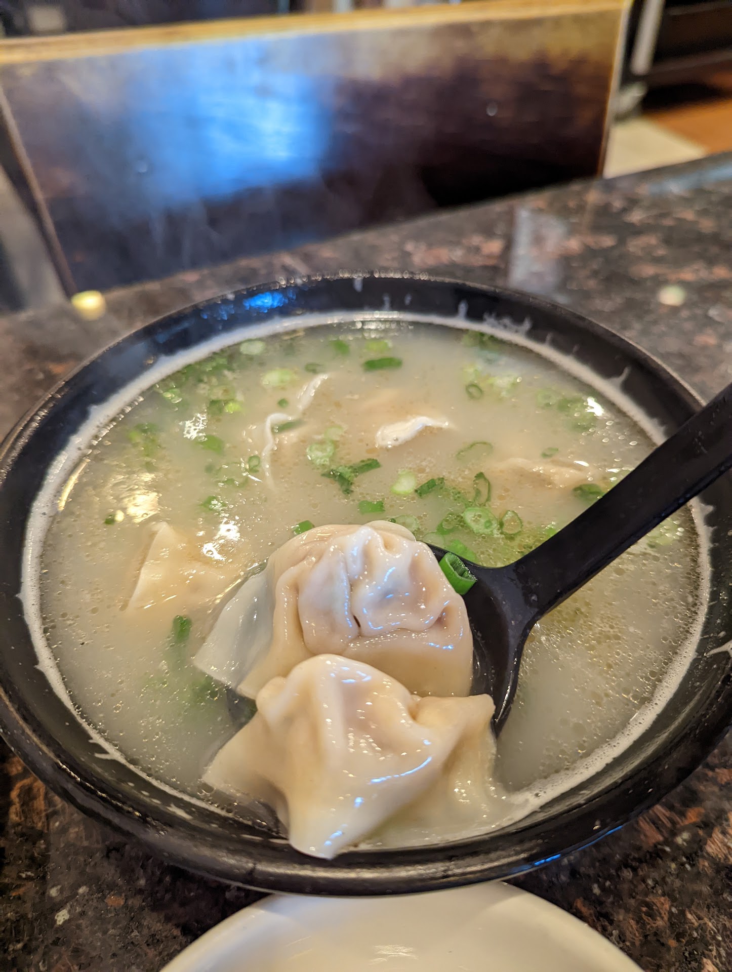 Rounding out our meal were the steamed chives/pork/shrimp dumplings and the pan fried pork buns. Between the two, the dumplings showed more finesse. The skins again were remarkably supple and generously filled with the meat and veggie mixture. The pan fried buns were a little too generous in size. You had to chew through a good amount of bread before you got to the soup and meat inside. The bottom were golden, but not evenly so.