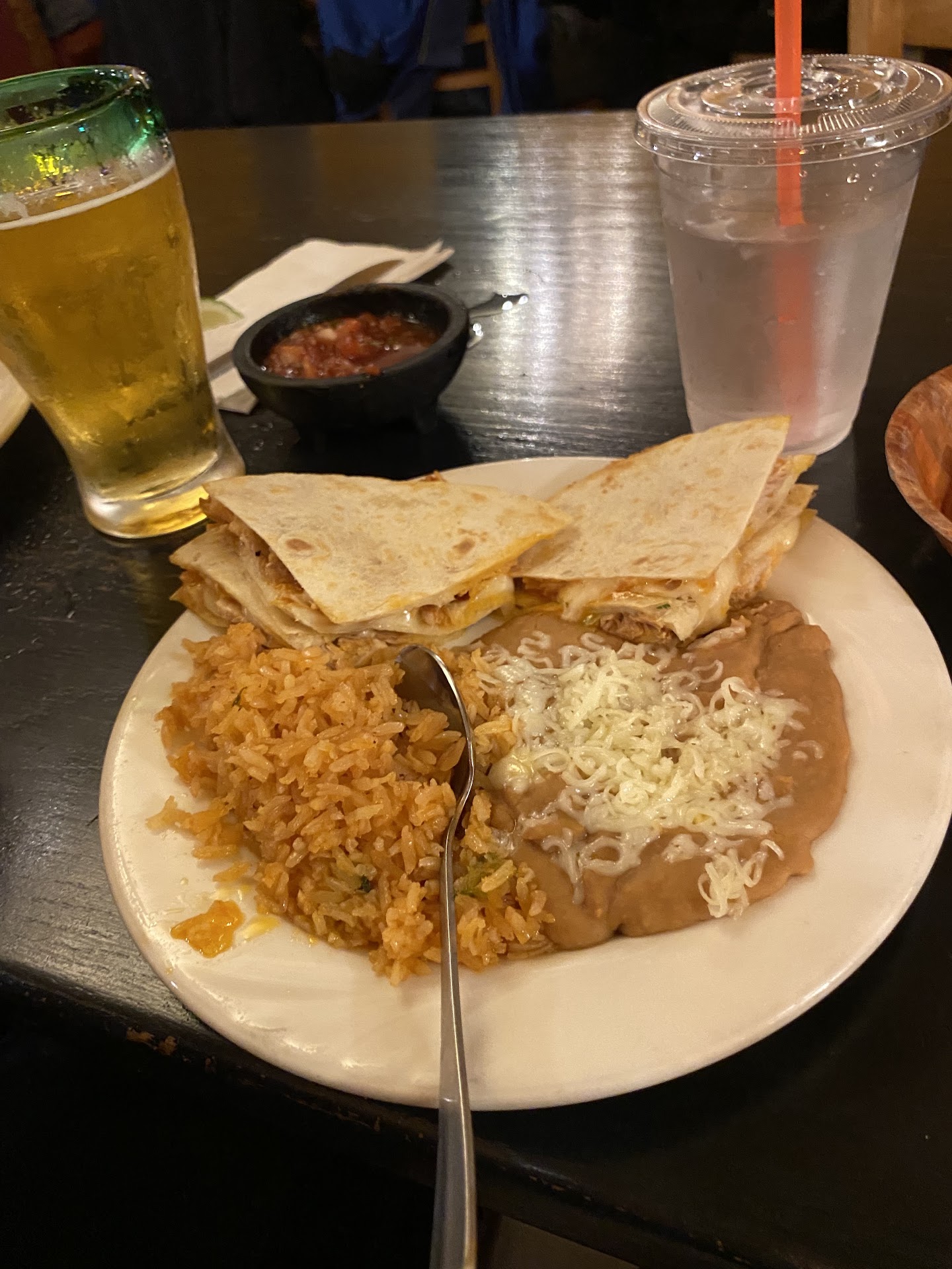 Food wasnât too bad. The chips and salsa were refillable. The salsa for some reason tastes like the salsa of a grocery store shelf like Pace salsa. Chips were warm but a bit hard to the bite. Meats were rather bland sadly. My husband ordered the super burrito, carnitas. He also mentioned that the carnitas were bland. My daughter had the chicken quesadilla but she had hardly touched her food. I had the street tacos with half carne asada and half shredded chicken. One of the carne asada taco was slightly tough and over-cooked. Again sad to say, the meats were bland âšď¸. I also ordered the virgin pina colada, which was delicious.