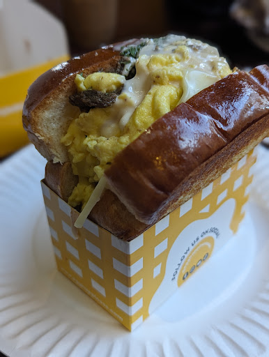 I know egg is the focus, hence the name, but it was a bit too much egg for me. The egg consistency is fluffy and creamy. The texture over all is one note, the bread is soft, the egg is fluffy and mushy, the meat is soft. The meat is the only item that had more of a bite. The bread soaked up all the juices from the meat and eggs, so the texture was on the soggy side. The hubs had the same thought process regarding one noted texture and egg heavy sandwiches. If they had an option for fried chicken or fried egg, I think the different textures would be nice.