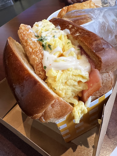 It's a very simple setting with the ordering kiosk next to the register and the food pick up area all on one side. The rest of the restaurant is the seating area. The prices are very reasonable. We ordered the spicy pork and egg sandwich, chicken and egg sandwich, and a cold brew for a little over 26 bucks including taxes. There's a little robot that brings the food out to the pick up area at the register as it calls out your order number. You just walk up to the area and grab your food. The drinks are called out for pick up by staff, only food comes out on the robot. There are other options like croissants and burritos if you’re not in the mood for toast.