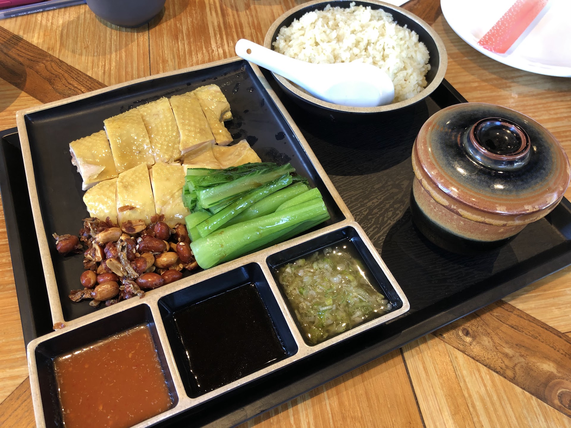 Ordered: Hainan chicken with slow cooked chicken ginseng broth (you can def taste the ginseng) Baked pork chop rice Wonton with rice noodles HK style milk tea (hot)
