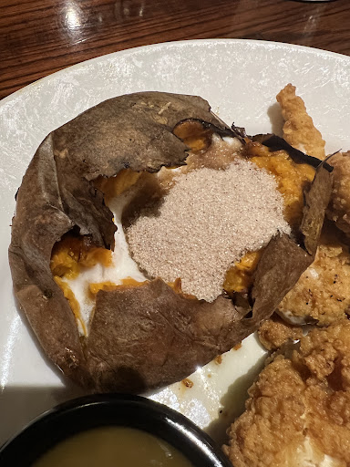 Our server was exceptionally friendly and attentive, ensuring we felt well taken care of throughout our meal. Her genuine enthusiasm and willingness to help made the dining experience pleasant from start to finish. For our main course, we ordered the 8 oz sirloin steak with loaded baked potatoes, which arrived promptly. My steak was cooked perfectly to order—juicy, flavorful, and tender, seasoned to enhance its natural flavors without overpowering them.