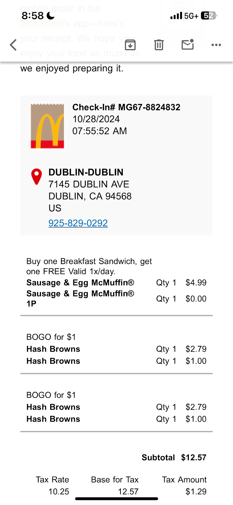 Read moreThis location is horrible. Fries and hashbrowns always taste old, rarely have a good experience here but decided to give it a shot since it's so close to me. I wanted a special big mac ( I like to modify it with the quarter pounder patties ) as I've done so here before with ease with the managers help. I try to tell the lady in Spanish as I'm bilingual but she said she'd have to get the manager. The manager comes out with kind of a attitude and attempts to take my order. Shes talking about how she has to charge me extra for the bread and I tried to tell her all they do is charge me for a double quarter pounder and make me a special big mac. She wasn't having it and was acting as if it was coming directly out of her personal checking account. I got so annoyed that I left and went to the San Ramon location down the street ( where I religiously always have a great experience, staff is a lot nicer too) and had no problem ordering what I wanted without the bickering and bull$#it that I always deal with at the other location. Worst part was the manager at the first location was almost going out of her way to say ok thank you have a nice day thank you have a nice day which I found sarcastic and completely fake! Dont say have a good day lady if you genuinely don't mean it!!! I wanted to curse her out so badly but then I would have looked like the nut lol Dublin location sucks, I've had better experiences in rougher parts of the bay area. I've even walked in before where all employees are looking at one employees phone and ignored us customers til they were all done looking at some online post....