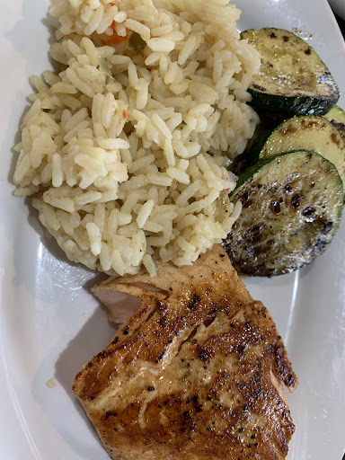 I ordered the grilled salmon with rice pilaf and zucchini. The salmon was cooked and seasoned perfectly. Everyone in my party enjoyed their food.