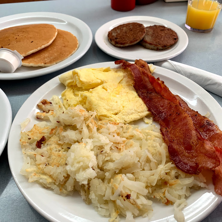 We had an omelet and a deluxe breakfast. The omelet was fluffy and covered half of the plate. The hash browns are crispy on the outside, just like you would want it. The deluxe comes with choices of sausage, link or patty or bacon. You get pancakes, eggs and toast, wheat or white.