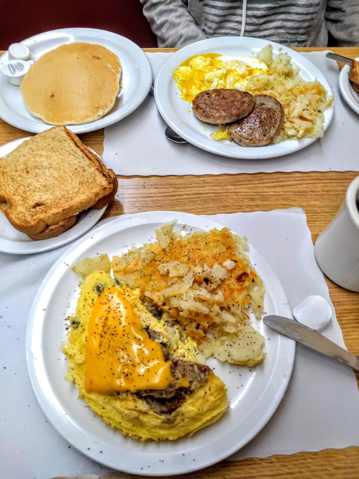 We had an omelet and a deluxe breakfast. The omelet was fluffy and covered half of the plate. The hash browns are crispy on the outside, just like you would want it. The deluxe comes with choices of sausage, link or patty or bacon. You get pancakes, eggs and toast, wheat or white.