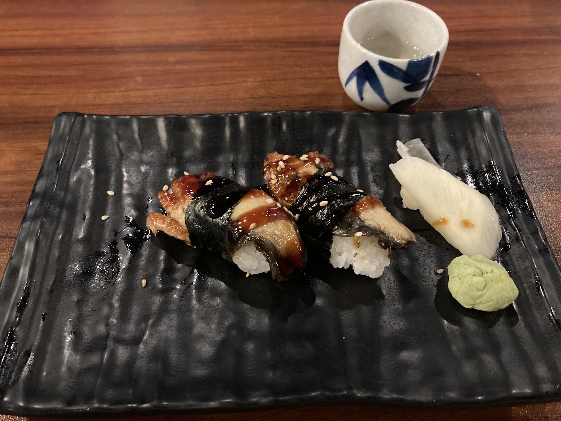 Gyoza are always my tell when trying a new Japanese restaurant. These were excellent little pork morsels in delicate tender skins, most excellently prepared, but may have been a commercial frozen product. The sauce was a Chinese style mustard, excellent, but not a classic Japanese presentation. Still, the plating was far better than most I’ve had lately, other than my own preparation, of course.