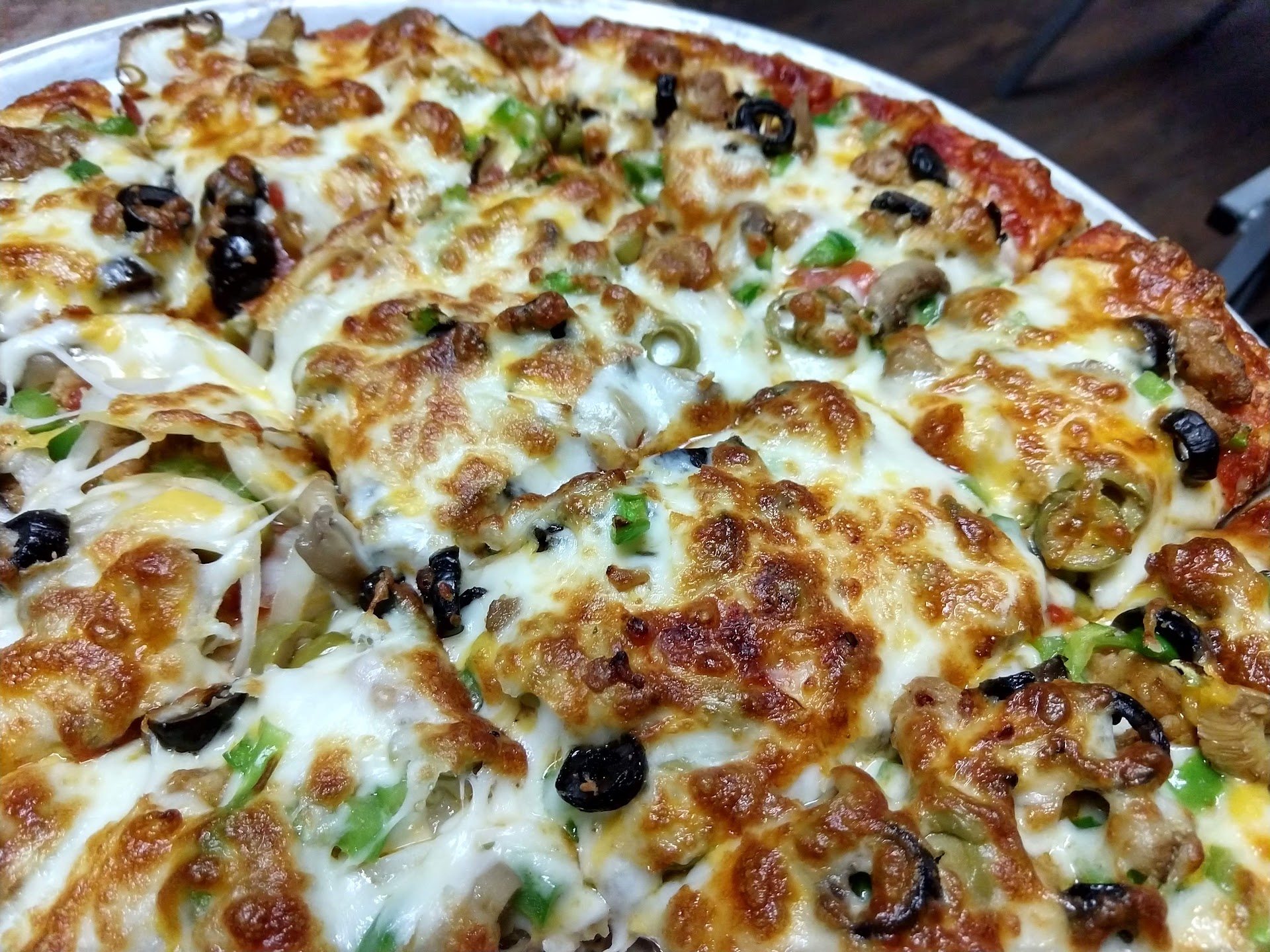 We actually went there for lunch Christmas day. It was our first time eating there. We ordered the 14" meat lovers pizza. Oh my gosh it was so full of meat and cheese. Probably 3 inches deep. Not counting the crust! It was delicious. It was so filling that we could only eat two squares of pizza each. They have breakfast pizzas, garlic bread, appetizers, as well as burgers, fries, onion rings and so much more. The tables are spaced out nicely. Their was only one employee running the entire place because it was a holiday. He was nice, and we got our food in about 15 minutes. I definitely...