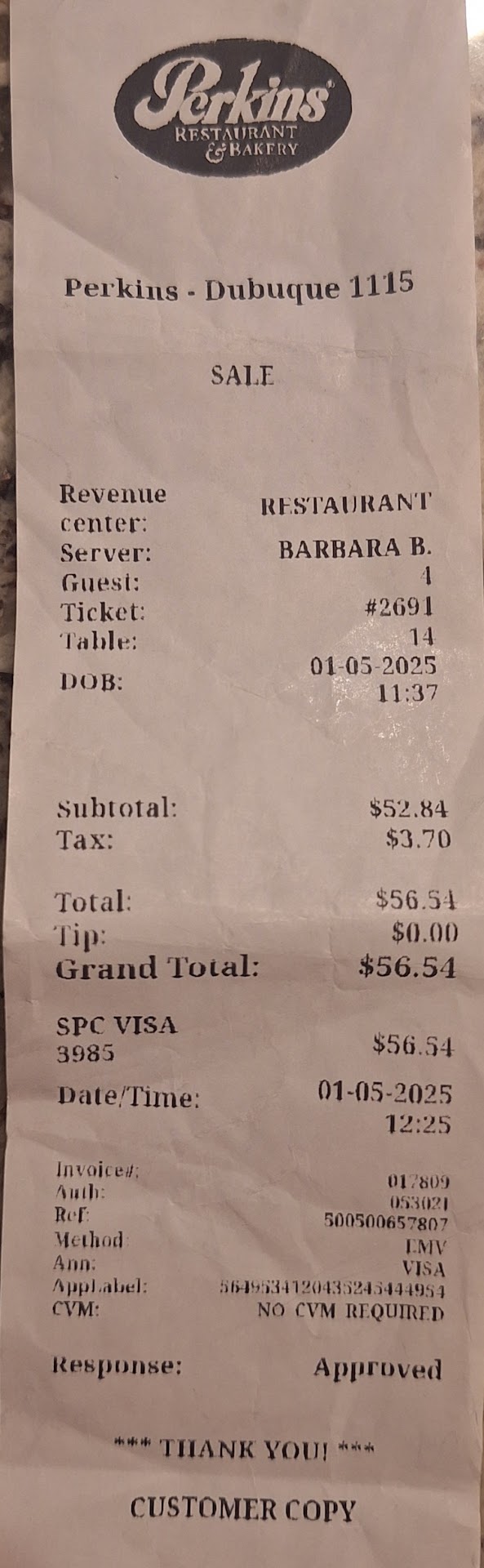Read more1-5-24 We stopped in around 11:30am, 2 adults 3 kids, everything started off well. My kids ordered lemonade, there was only enough for 2 and it had to get changed out, so my oldest daughter had to wait. Our food came out quick enough for us. As we are eating sitting about 20 feet from the back room/kitchen entrance, we heard staff arguing about tables, one younger girl visibly flustered came out mumbling to just shut up. From here it just went down hill. Idk if our table was the one being argued about but we recieved no future service. My daughters drink was never brought out nor a substitution offered and everyone elses drinks were never refilled once. Our server Barbara forgot our kids cookies. We waited about 5 minutes after everyone was done eating for a server to come check for boxes or give us a bill, I took my son to the bathroom and came back out and waited another 5 minutes and eventually had to go up to the cashier ask for the cookies a box and for our bill so we could leave. I left no tip, I was probably charged for the lemonade we never recieved but at this point we were just ready to leave I didn't care to check the reciept. I think Perkins needs to make a better effort to ensure all there guest are taken care of in a timely matter and maybe this location needs to work out there crews to avoid fights and future conflicts. I understand stuff like this happens but we will probably look for other dine in options...