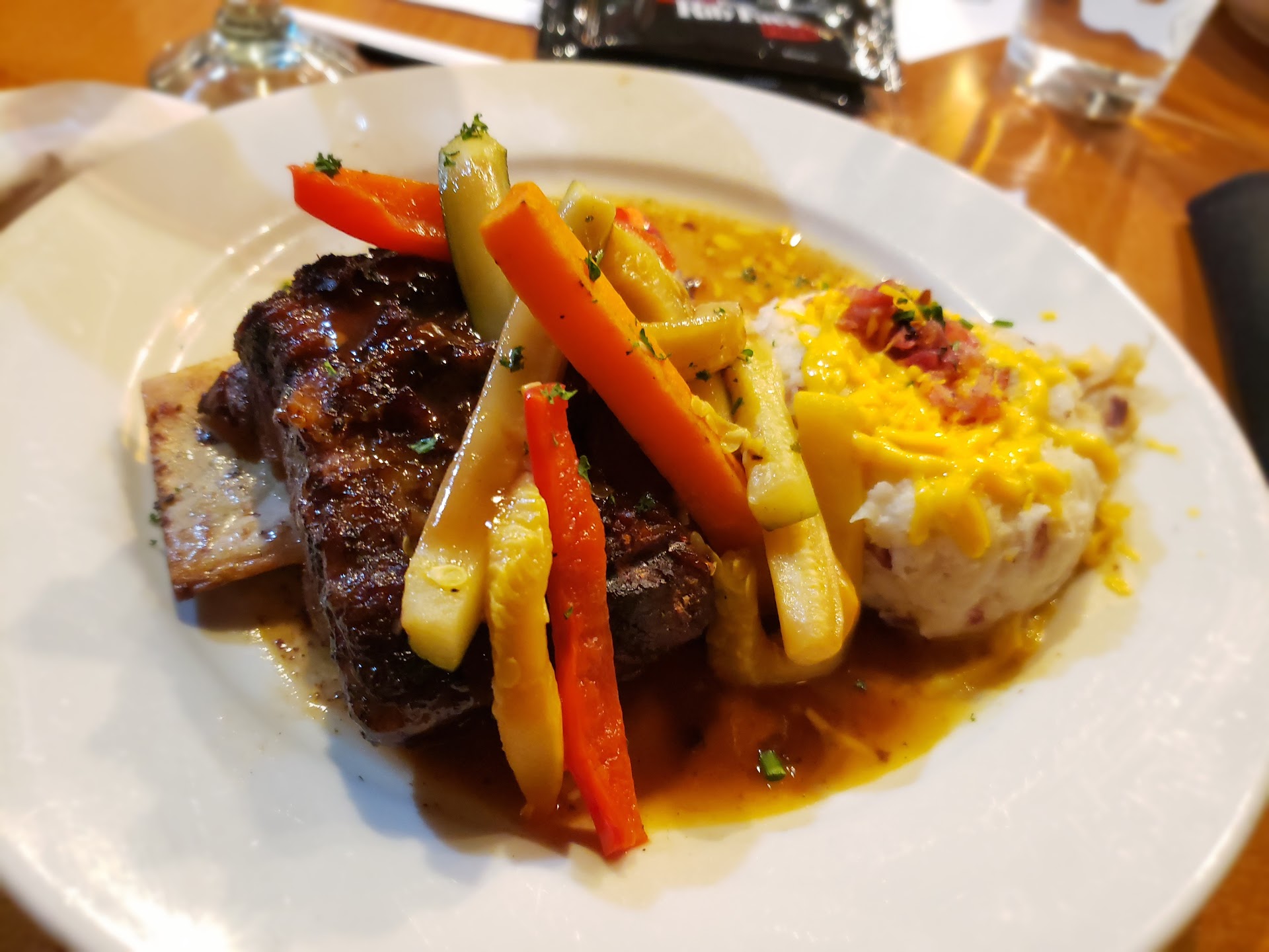 Anyway. Our server was pleasant, but maybe needs more training or something. I asked for the St. Louis ribs with bourbon barbecue sauce. There was some kind of confusion over that that I didn't really understand. Apparently they have these tablets they carry around to put the orders into and she wasn't sure how it worked or the sauce I asked for wasn't an option on the tablet... something like that. She said she had to go check on it with the kitchen and see if the could do the bourbon barbecue or not. She said she'd be back to let me know. She was gone for quite a while and when she came back she had our food.