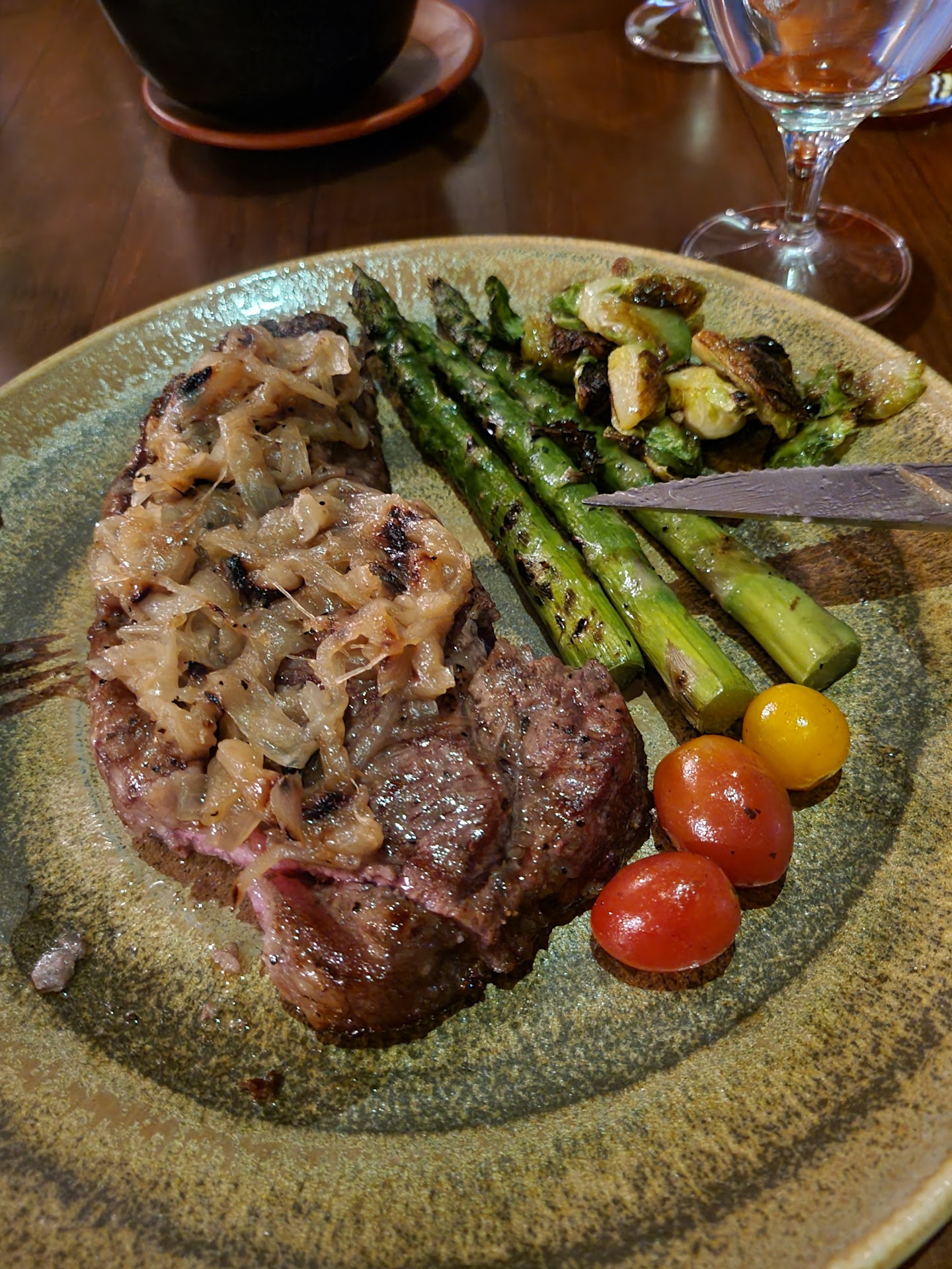 Read moreWe were visiting our daughter and was looking for a nice fine dining spot. I’ll start with the pros. The atmosphere was great. Our waitress Lilly was absolutely amazing. She always had a smile on her face, tentative and answered all her questions. The chicken Elote flatbread, French onion, soup, and brussels sprouts were delicious. Now the reason we gave it a three star. The food was beautifully presented, however, almost everything we had was super bland. If only the food tasted as good as it looked. My husband got the ribeye steak and it for sure was the worst ribeye steak we have ever had. It was so tough to chew. We had to cut it up into miniature pieces. At $50 a steak with no sides it was quite disappointing. Neither one of us think it was actually a ribeye. It didn’t have the marbling you typically see in a ribeye and the texture and taste of a roast. We were given the option to order fries plain instead of truffle fries, which we did, and was surprised we were charge the same price. It was our fault for not asking. The beef stroganoff was well cooked but unfortunately lacked flavor. The burger was OK. It tasted like any other burger, definitely not a $22 burger. We think it would be a great spot for drinks and appetizers but would not return for a...