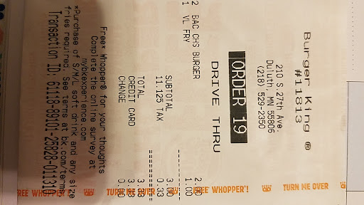 Burger King King connected to the Holiday gas stationwhere I filed my car. I was going to be headed out of Duluth for a 3.5 hour drive back home. It was very convenient. That is where the pleasantries ended. I kept my order SO BASIC. I ordered 2 bacon cheese burgers and a value fry. Let's start with the experience... the gal taking my order was nice enough but the credit card machine was not working. It froze up. NO ONE KNEW WHAT TO DO. So, I made the suggestion to just ring it up proper on the next register. No one took the the time to hear that suggestion at all. Instead she said that she could take my credit card and walk over to the drive-thru window and ring me up there. I did not appreciate the fact that someone wanted to walk off with my credit card, with the way life is nowadays with identity theft. So finally the lead woman came over, was punching in all kinds of things and ultimately completely disconnected the credit card machine from the counter and brought it into the back because it would not take off the charge that they were originally giving me at this counter. I did want the food so I ended up letting the gal walk off with my credit card and ring it up on the drive-thru register. That is why my receipt says drive-thru. But it was fully a dine-in experience. The lead did apologize about the mess it created. Now here's the food experience.The value fries were not hot. I am guessing because my order was filled and sitting somewhere while the mess was getting figured out. I did ask for fresh fries and recieved them with no problems. With the bacon cheese burgers everything was fine EXCEPT there was ONIONS on both burgers when there were not suppose to be. This is not an experience I care to repeat or have anyone else need to encounter so I left this review here. I hope it gives someone a good heads up before they go here. I hope they have...
