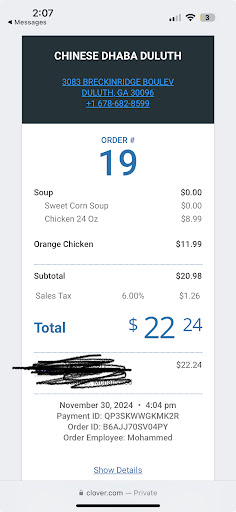 Today I was CHEATED at Chinese dhabba Duluth today. Well I have never complained about this place and I have been here for take outs many times Me and my husband both. the guy at the cash counter named Mohammed which is on my receipt probable thought I was a kid or new to making payments. . But I placed an order for take out worth 27 dollars with taxes . I tried to tap my card once but it dint work on their machine. However then I tried to put the card in the card sloth being a short person I could not see well the sloth so that guy at the counter took the card from my hand ( which he should have asked me before taking it straight away) and billed my card for 31. 05 dollars and to my surprise he himself added the 4. 05 dollar tip on his own without asking me. This is very unprofessional and extremely dishonest restaurant to do so. I could have complained and made an issue out of it. But I dint. The only thing I said to him was “ is the tip automatically taken. “ he dint say a word and behaved as if he dint know what happened or what he did. I let it go. 4 dollars is small amount but the way it was taken was wrong. I have been there many times and this was expected from them. This is called cheating your customers no matter the amount but he should have asked me before putting the tip on his own. I would have happily tipped him. Very wrong on his part. This is the way you loose customers. Just so if someone who is in authority at that place should take action so that this person doesn’t do the same thing with someone else. Everyone is not going to leave quietly. My order transaction no is 019632. Just so if someone...