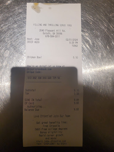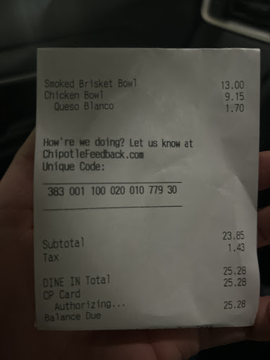 Read moreLike many others stated, I wish I had he option of giving 0 stars. I am thoroughly disappointed in my dining experience and do not plan to eat a Chipotle ever again, if I can help it. Having lived in the area for the last 20+ years, I am most familiar with and mostly order from this location. In the 7 years I have been coming here, I haven't had major issues (maybe an occasion or 2 where a topping was left off or smaller than usual portion sizes. Nothing major)... But i am disgusted with this last experience.