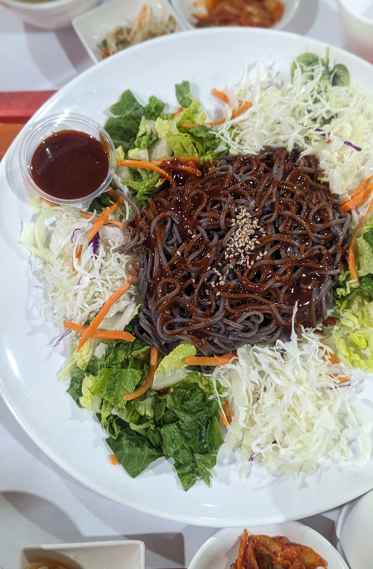 I asked them to make it non-spicy, a near contradiction for yukgaejang. To my surprise, they pulled it off. I ate every morsel. Just be warned that it’s hard to eat yukgaejang without splashing drops of it on clothing. It’s a dish that’s mostly slurped.