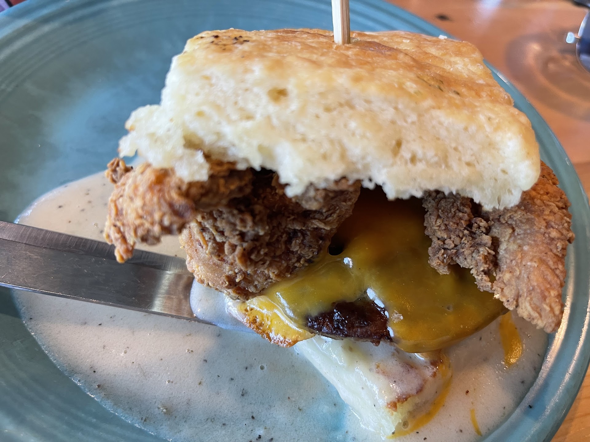 *Fried Chicken on a biscuit with country gravy It was overly deep fried and killed 3x over, I thought the gravy would save it but not when you only put one once of gravy on my plate. Come on man! You just shoved in my face that I’m paying 8% before I even picked an item, then this. Ouch The Chef picked up a little slack by serving a homemade biscuit but to no avail, no gravy.