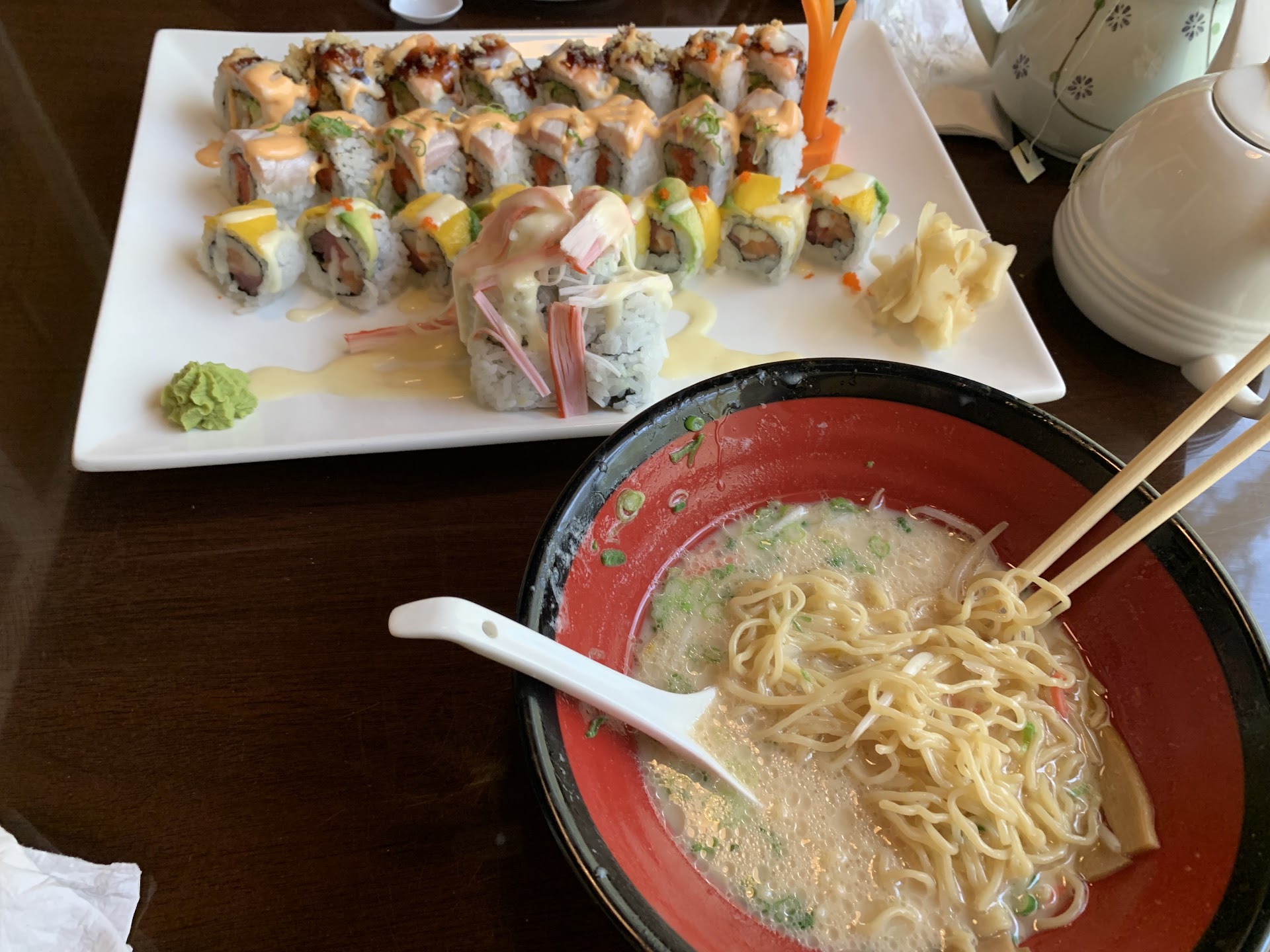 I ordered a simple spicy tuna roll. It was neon orange and not spicy at all. A bowl of spicy Miso ramen was really what I was looking forward to. Unfortunately, there was zero flavor in the broth. Literally it tasted like hot water. No spice, no seasonings, no ginger, garlic, oil, nothing. And the pork was sad, hard as nails, grisly little bone-bits, completely inedible. It looked so good, that steaming bowl. I was so sad when I ate some. The only thing passable was the egg, while overcooked, was marinates and I could actually taste it. Upon leaving, waitress asked if I'd like to sample some Hong Kong Iced Tea. I had overheard another customer raving about it and was curious. It was instant tea, with some lemon and maybe a touch of honey. Instant ice tea mix in Georgia? Oh, no. Sadly, I should've saved my money and gone to that ramen shop in Suwannee, or that great new sushi spot in FB. If you like less than mediocre food and answering the waitress every 5 mins, go for it. But there's a ton of way better options, especially...